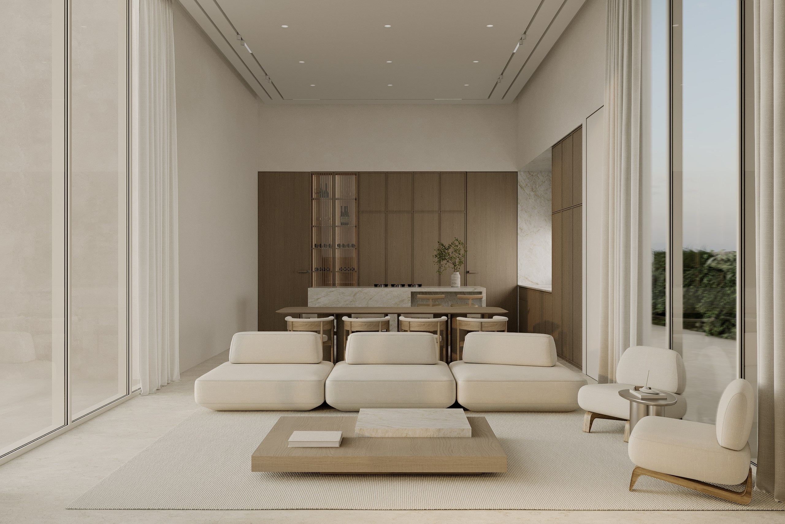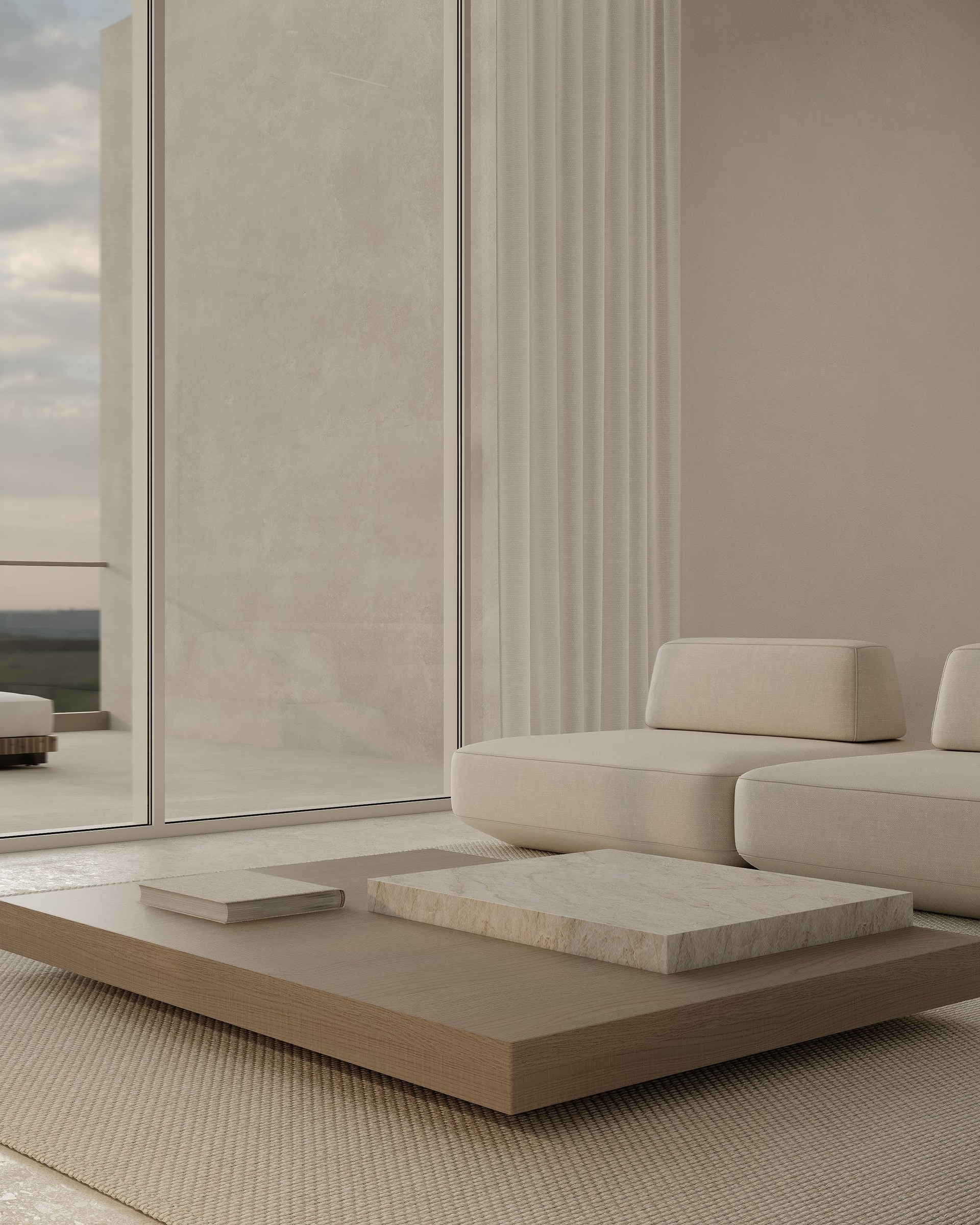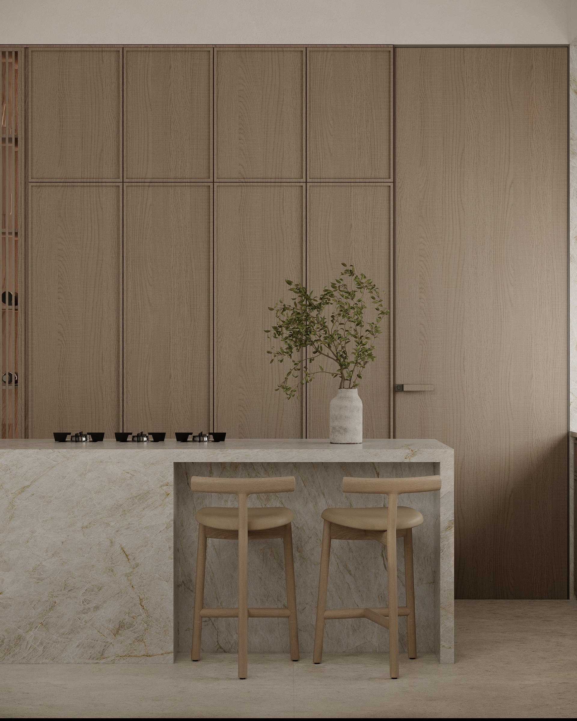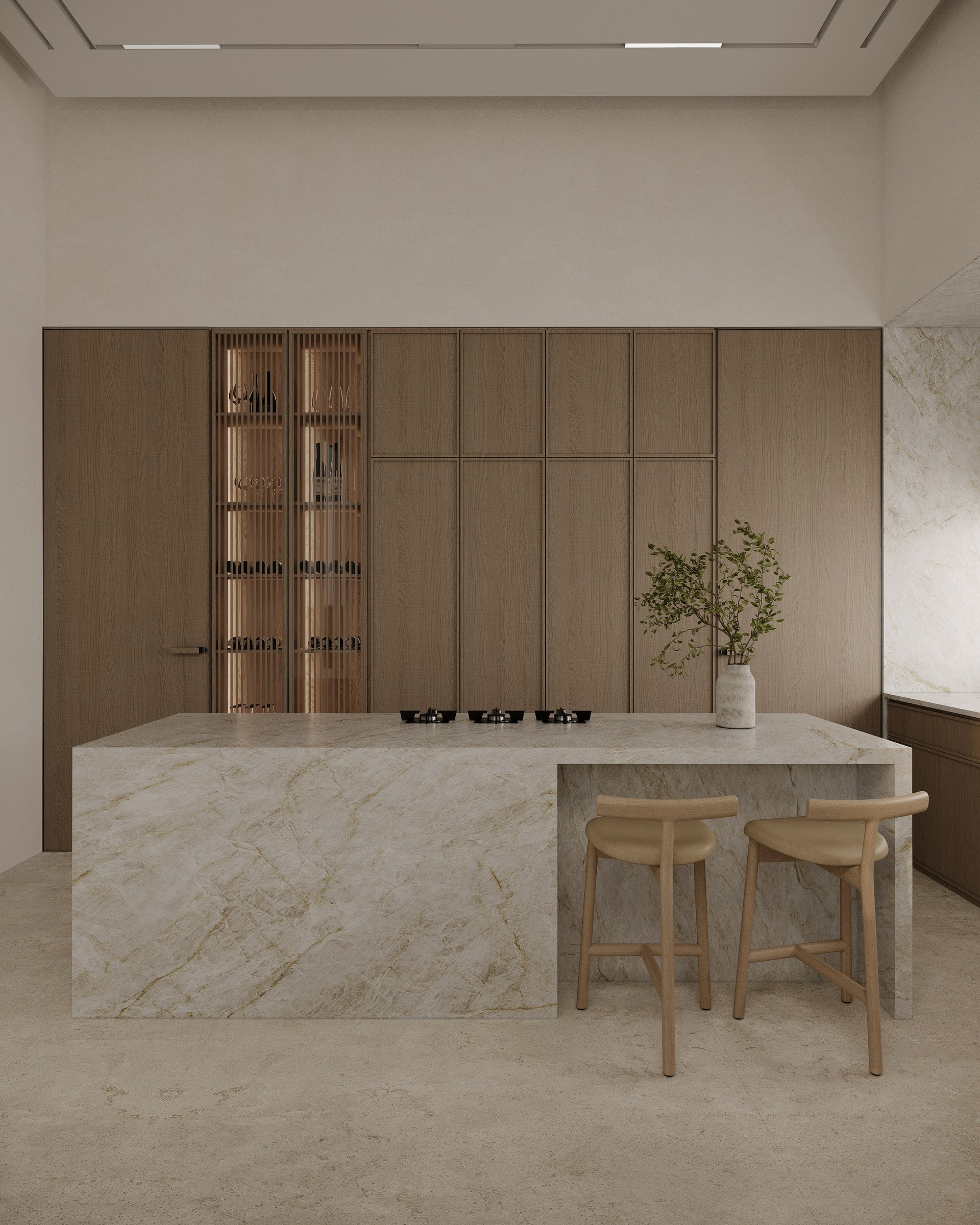Multi-version interior visualization study for a sophisticated residential project, exploring different lighting and material moods.