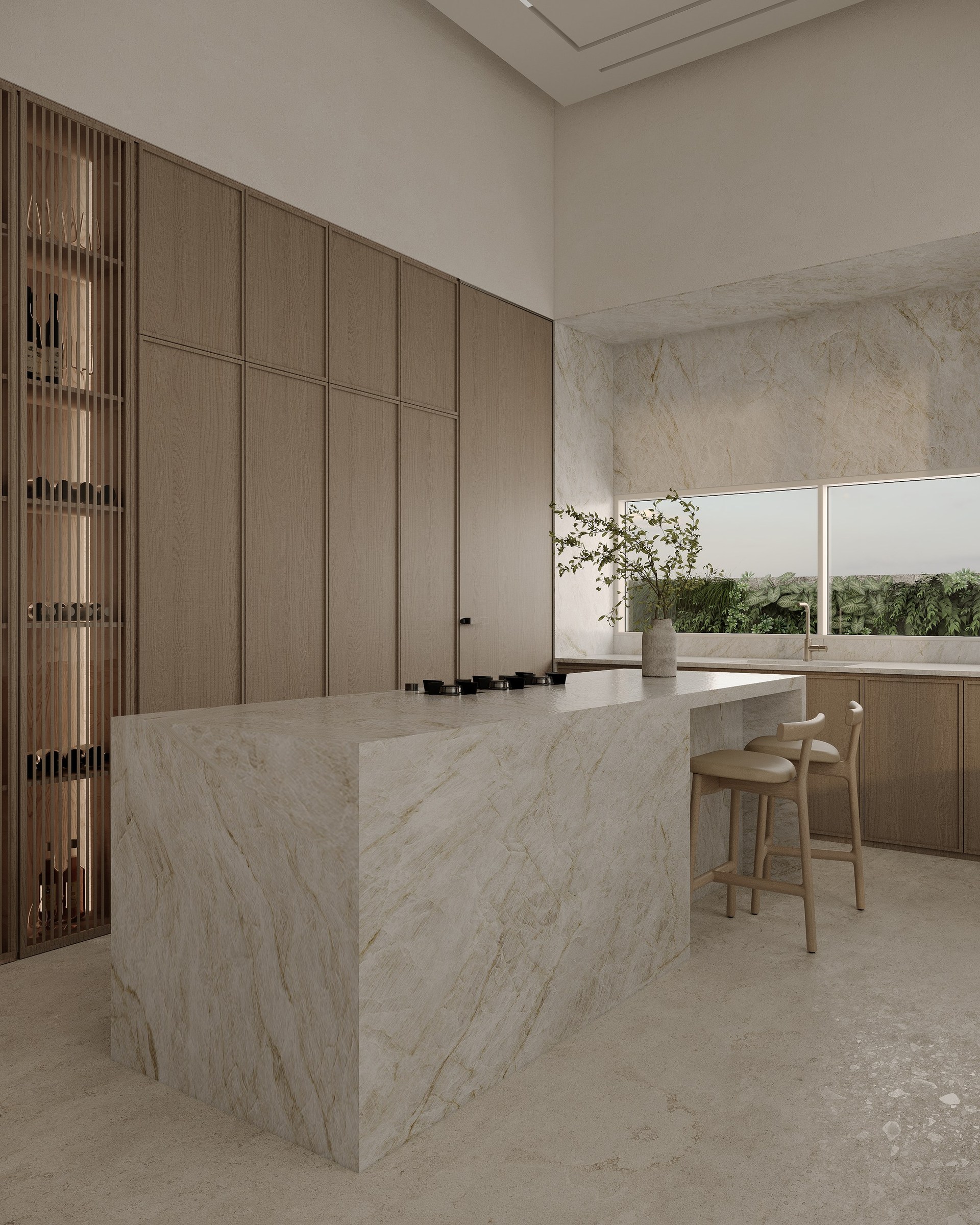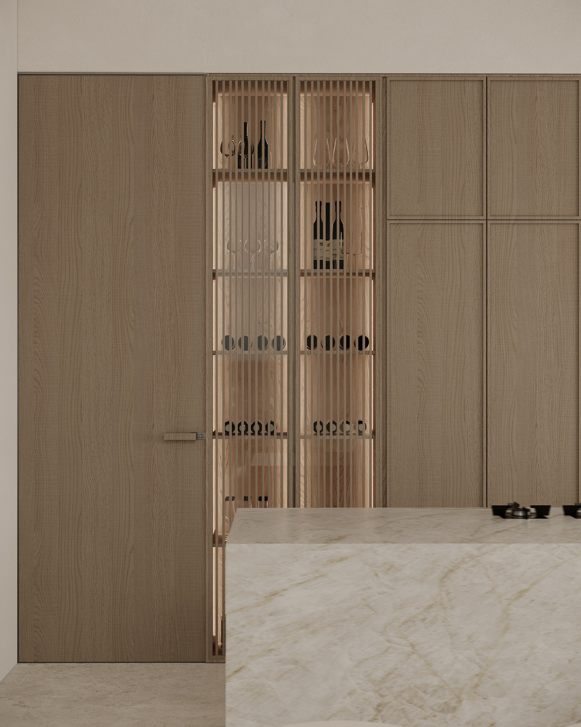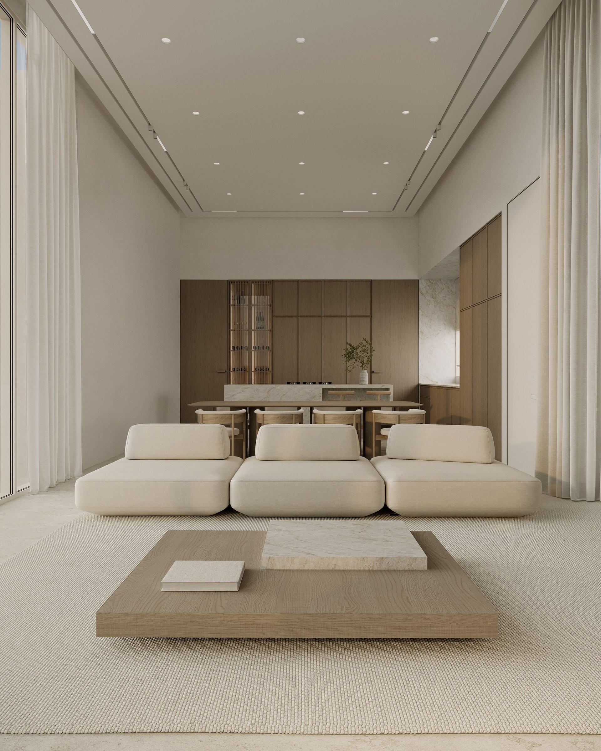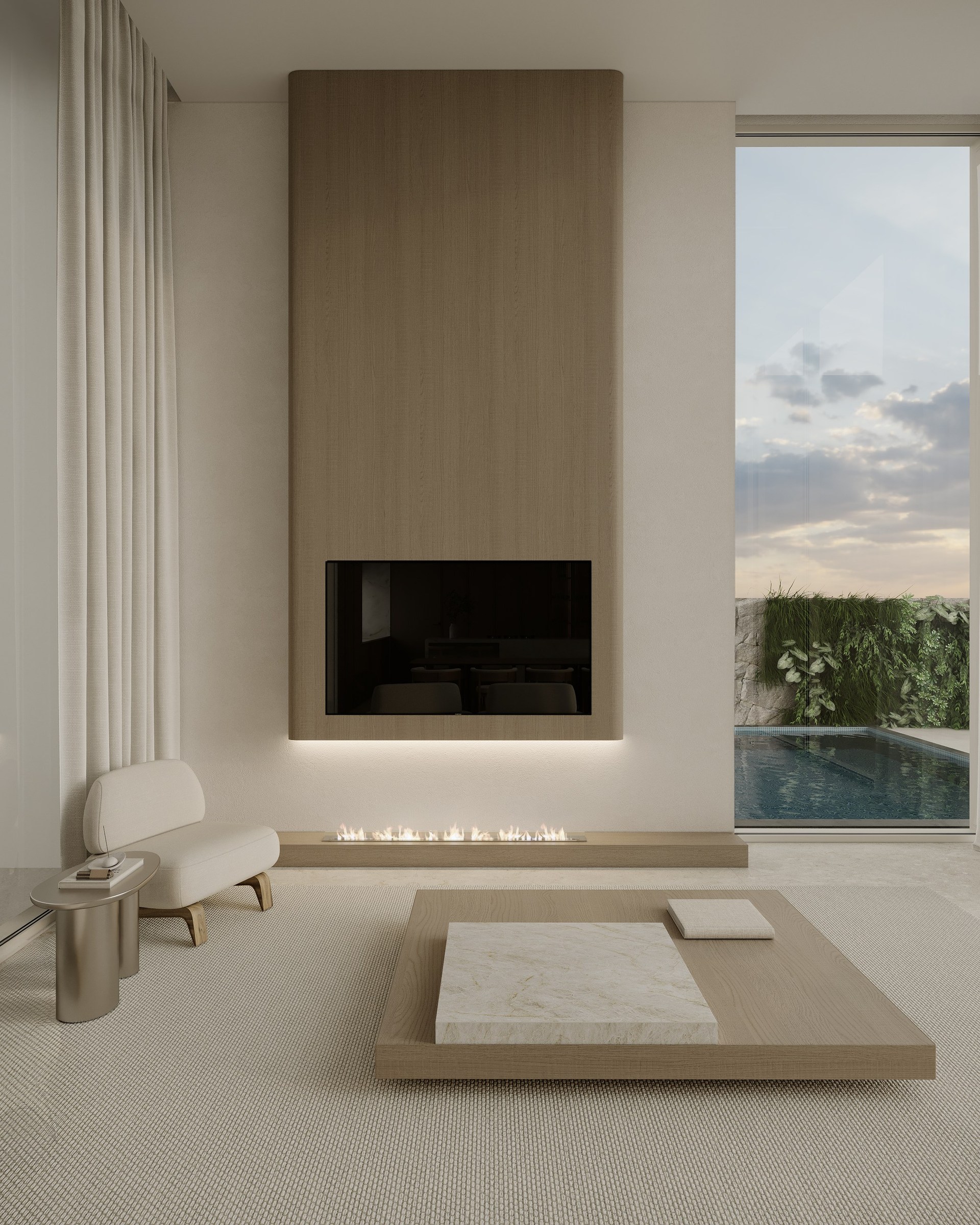 Multi-version interior visualization study for a sophisticated residential project, exploring different lighting and material moods.