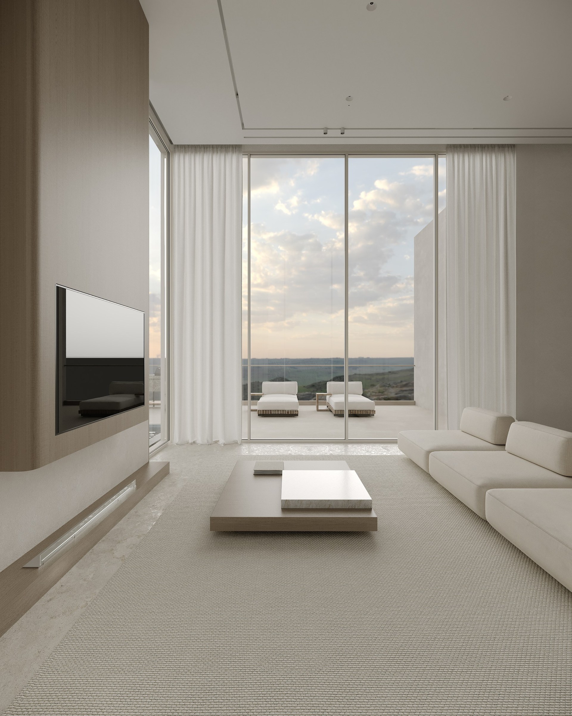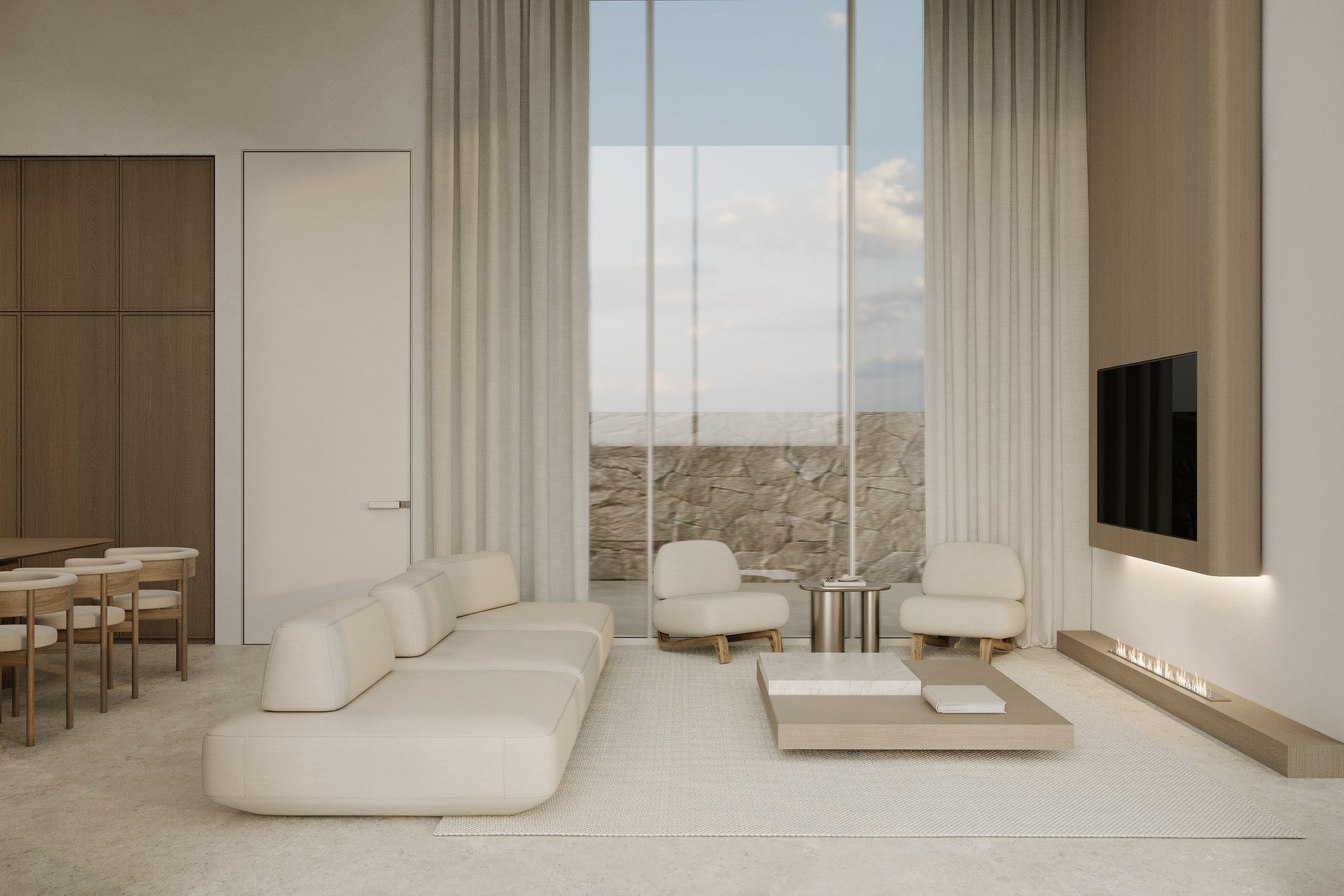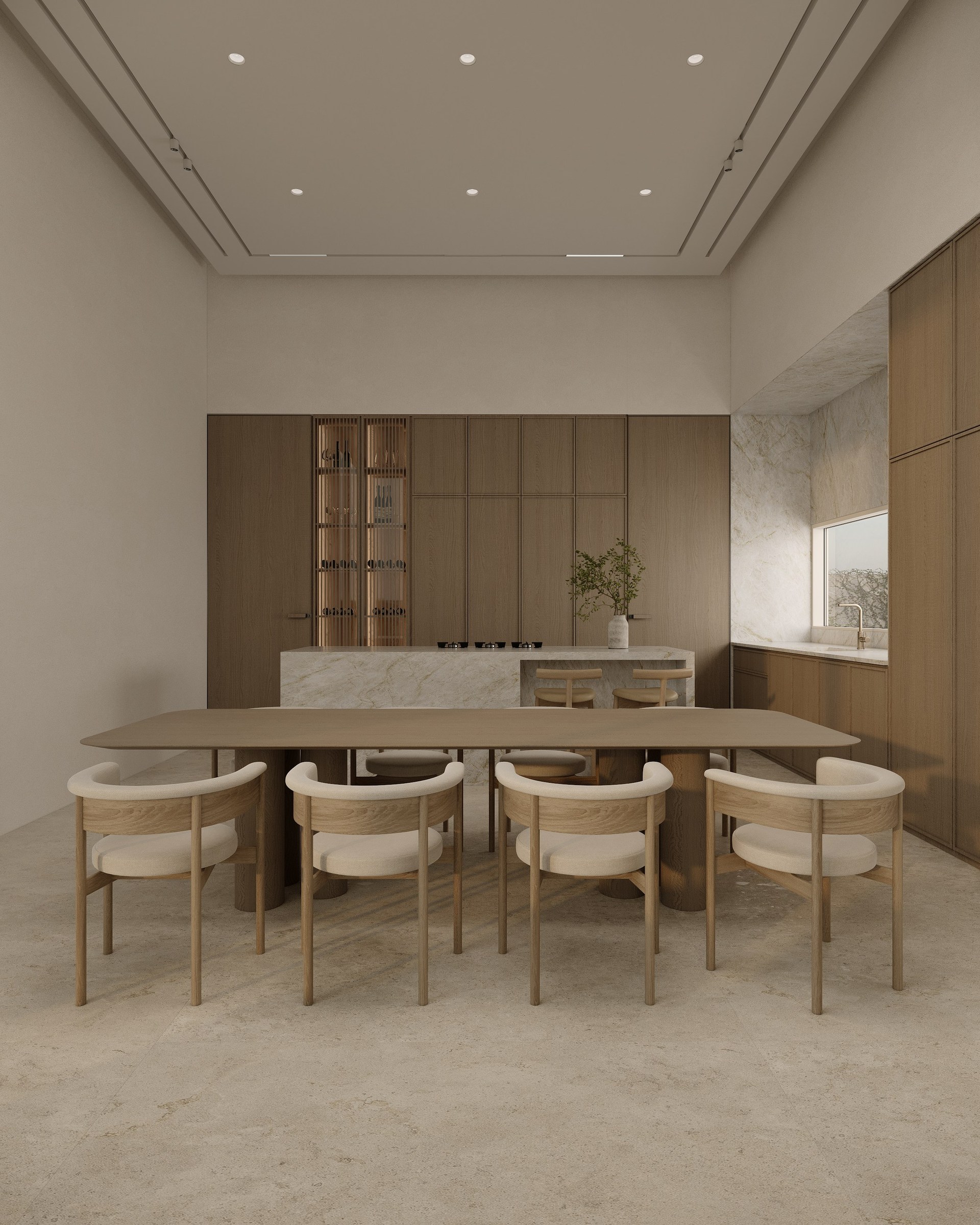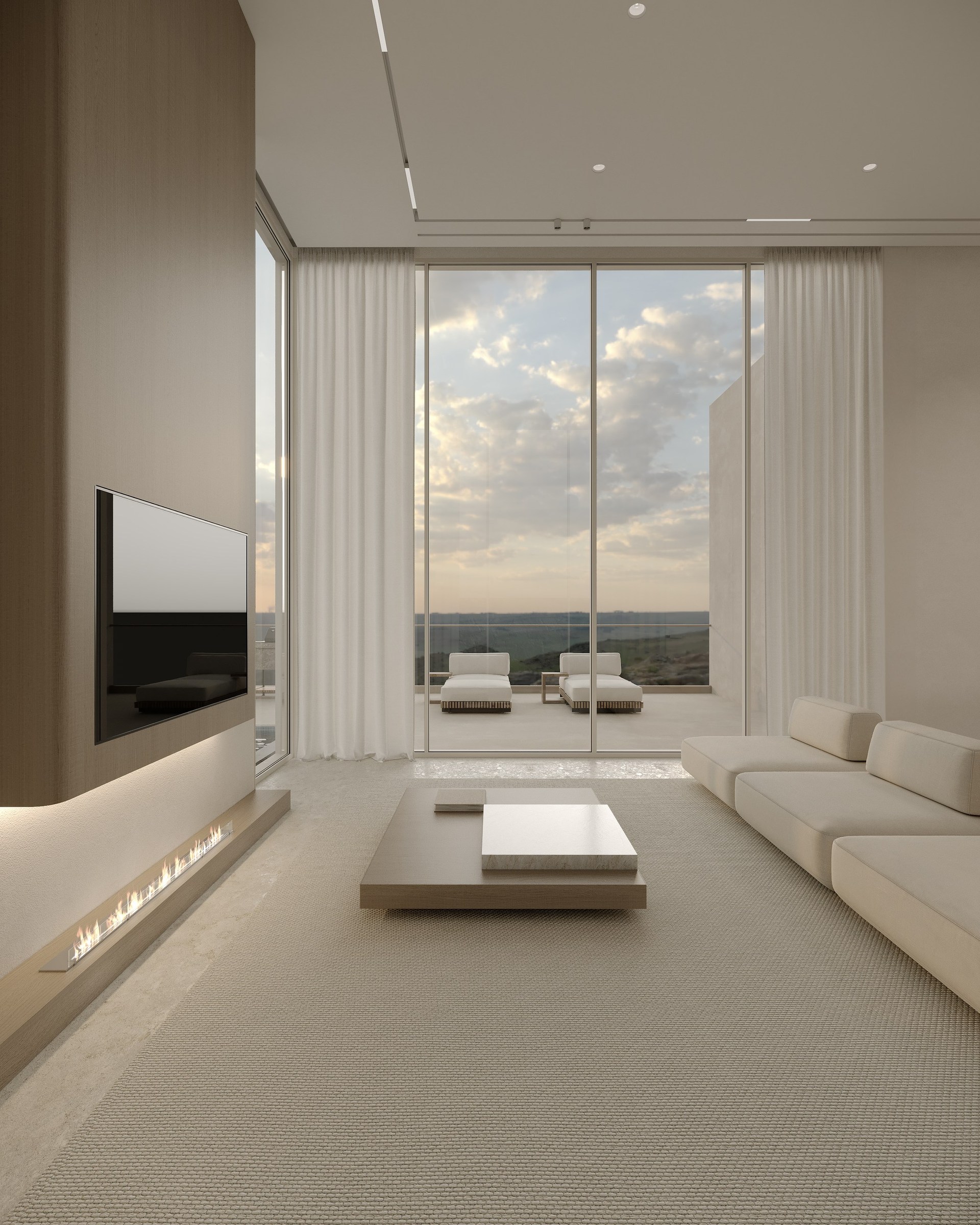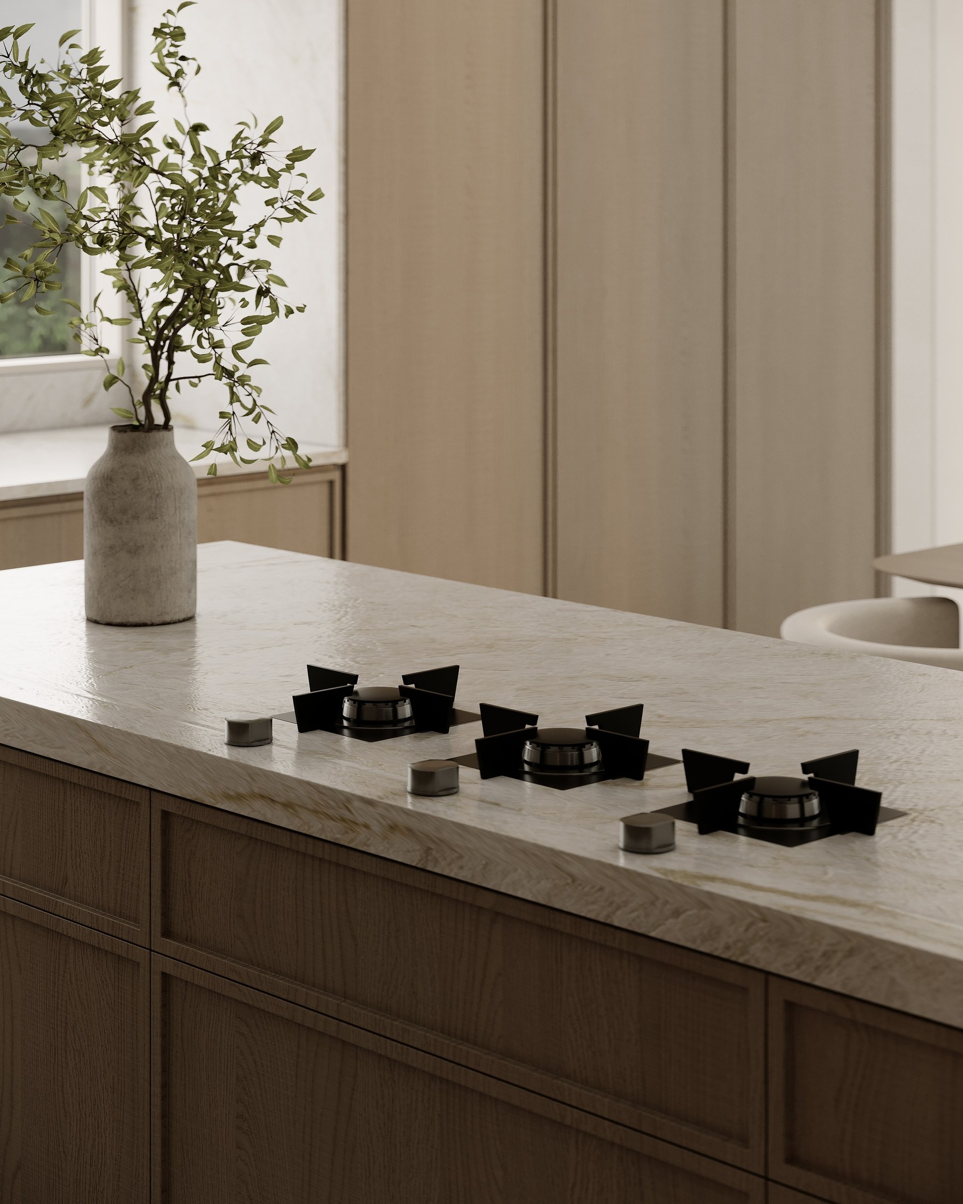 Multi-version interior visualization study for a sophisticated residential project, exploring different lighting and material moods.