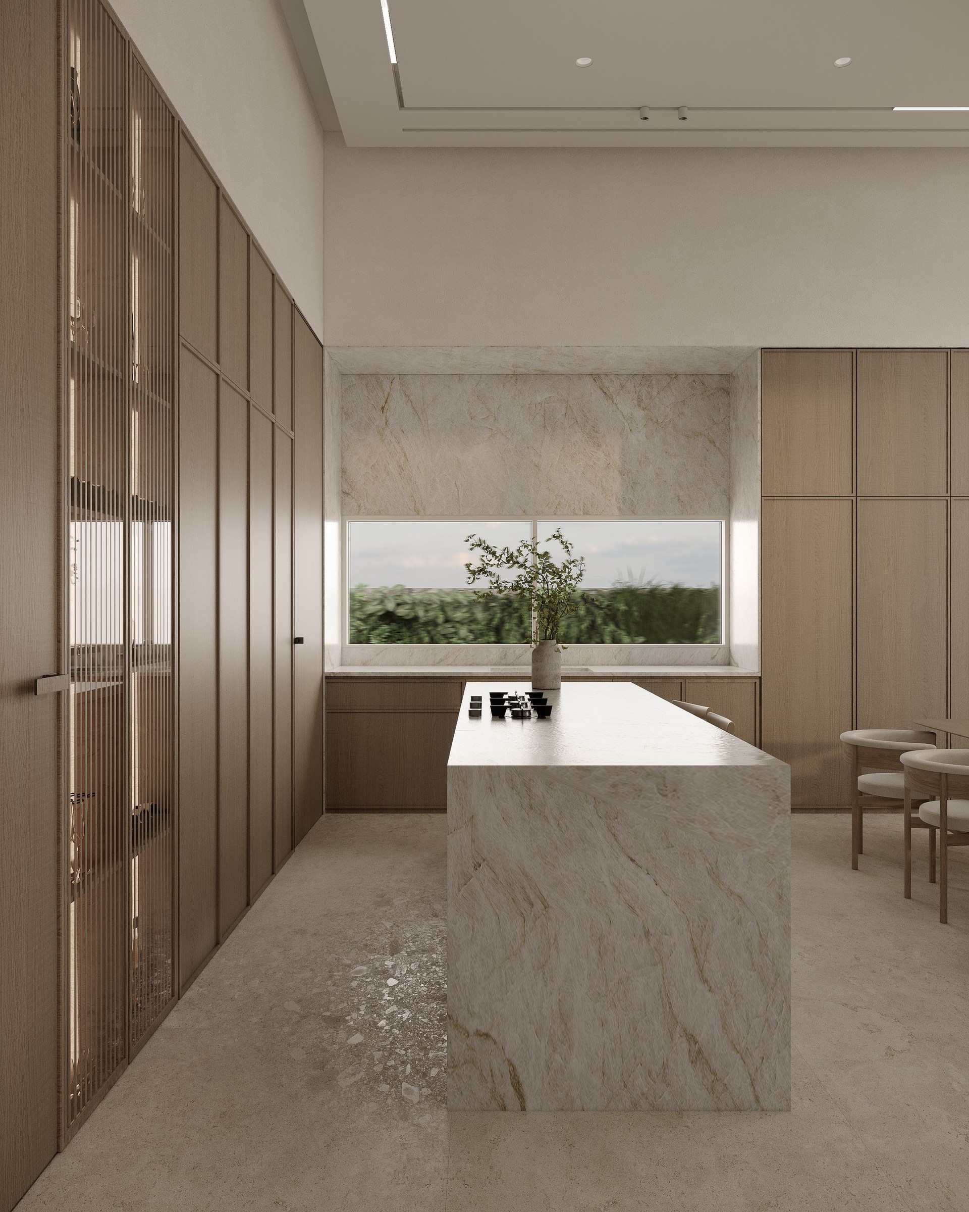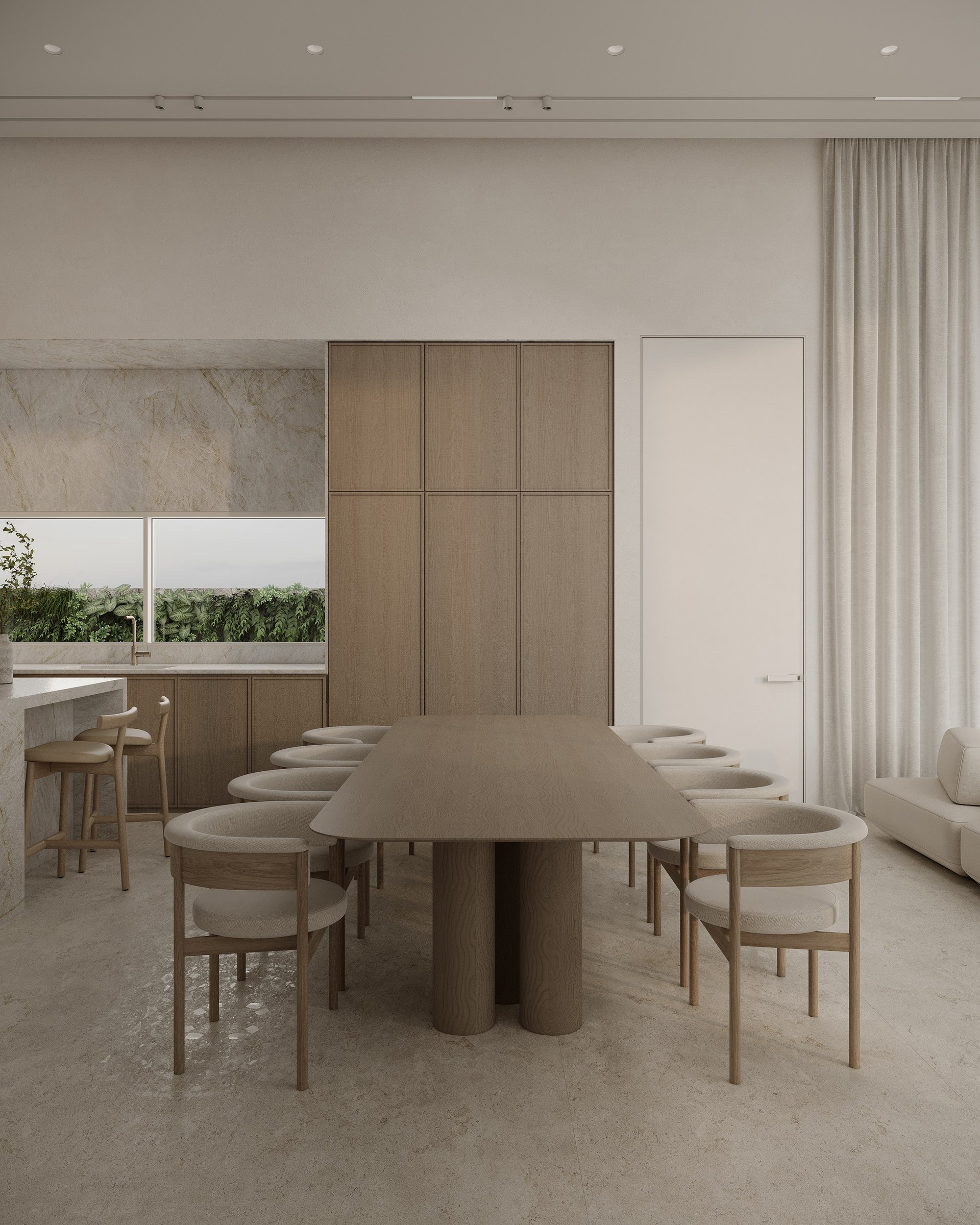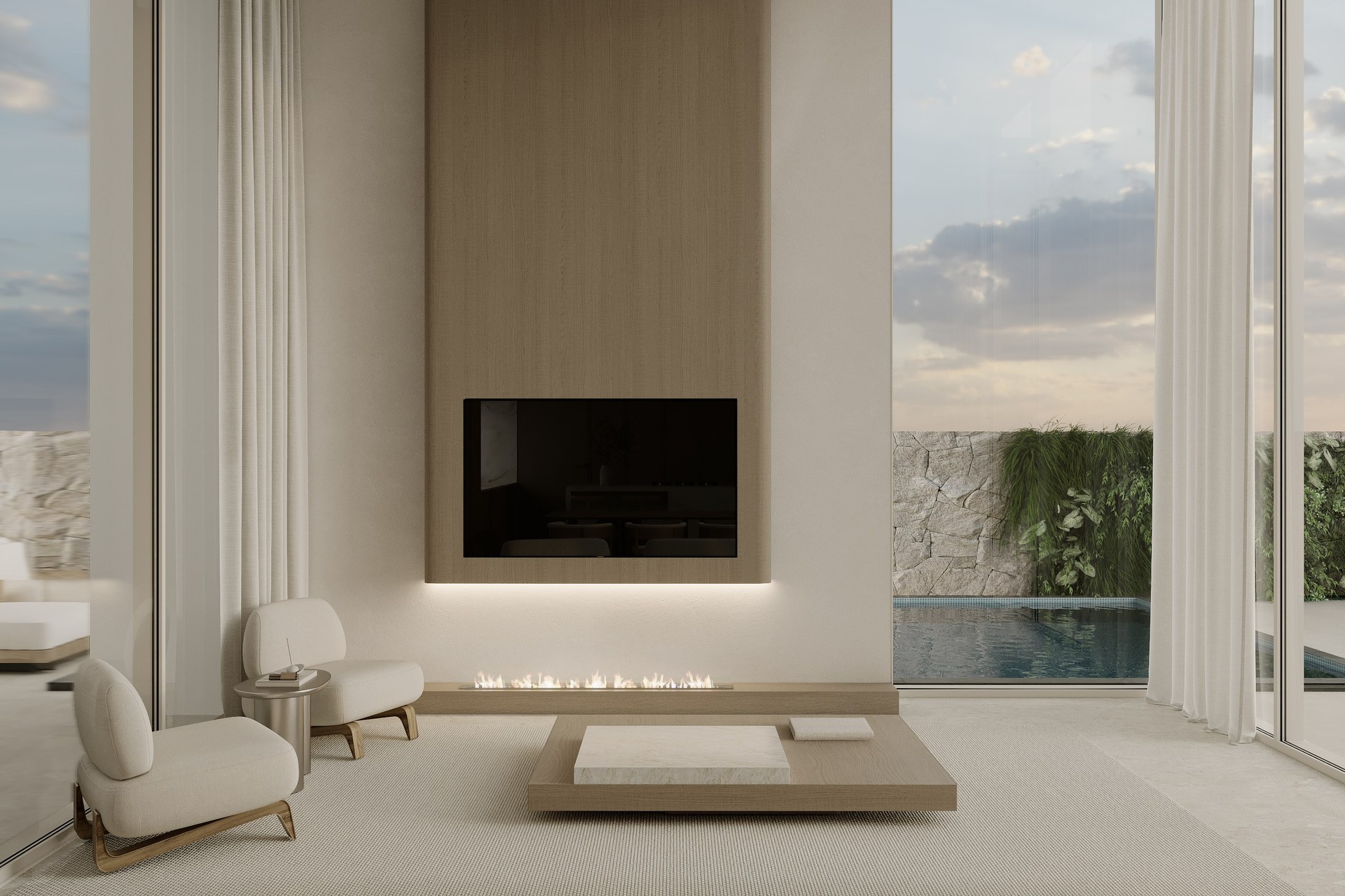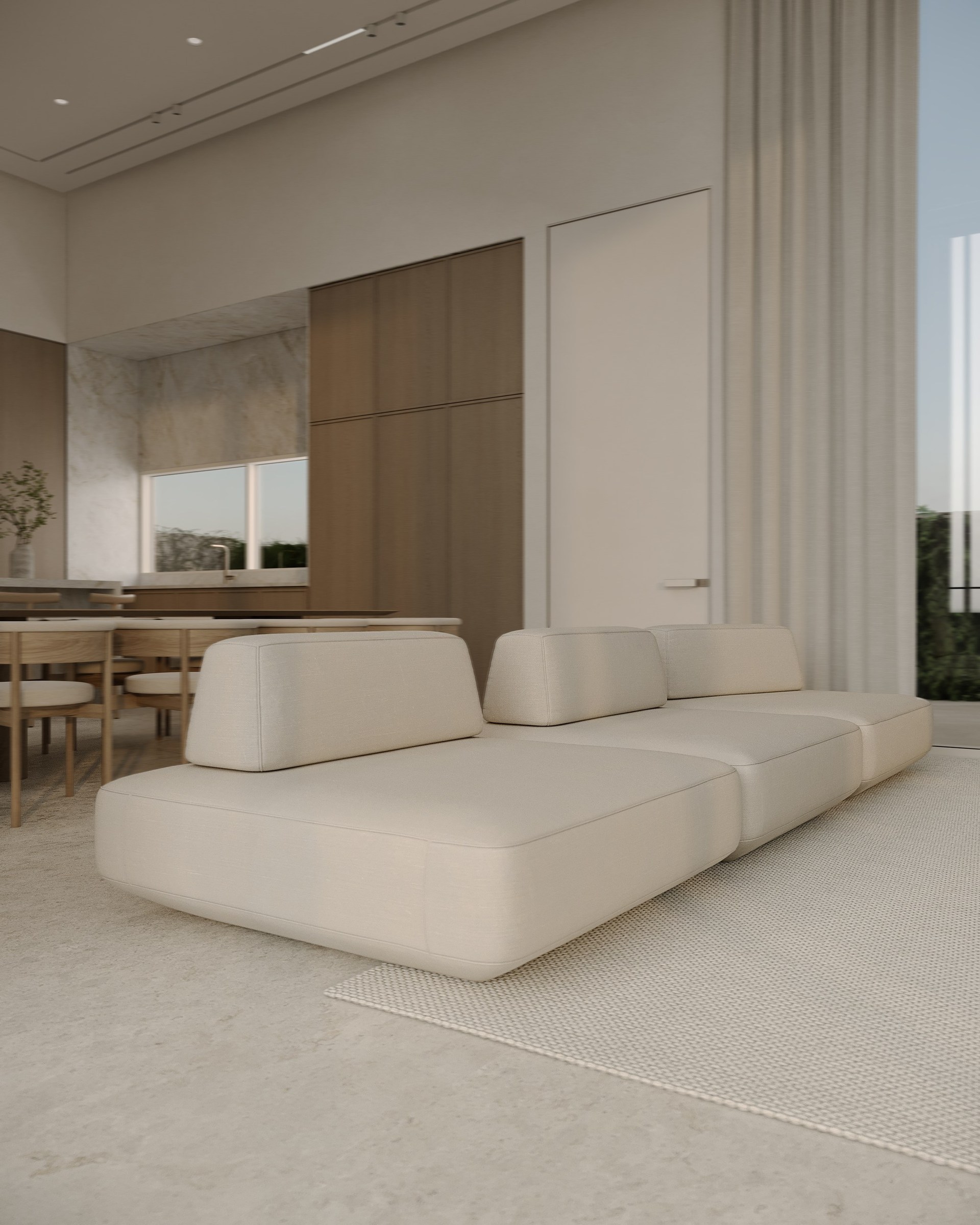 Multi-version interior visualization study for a sophisticated residential project, exploring different lighting and material moods.