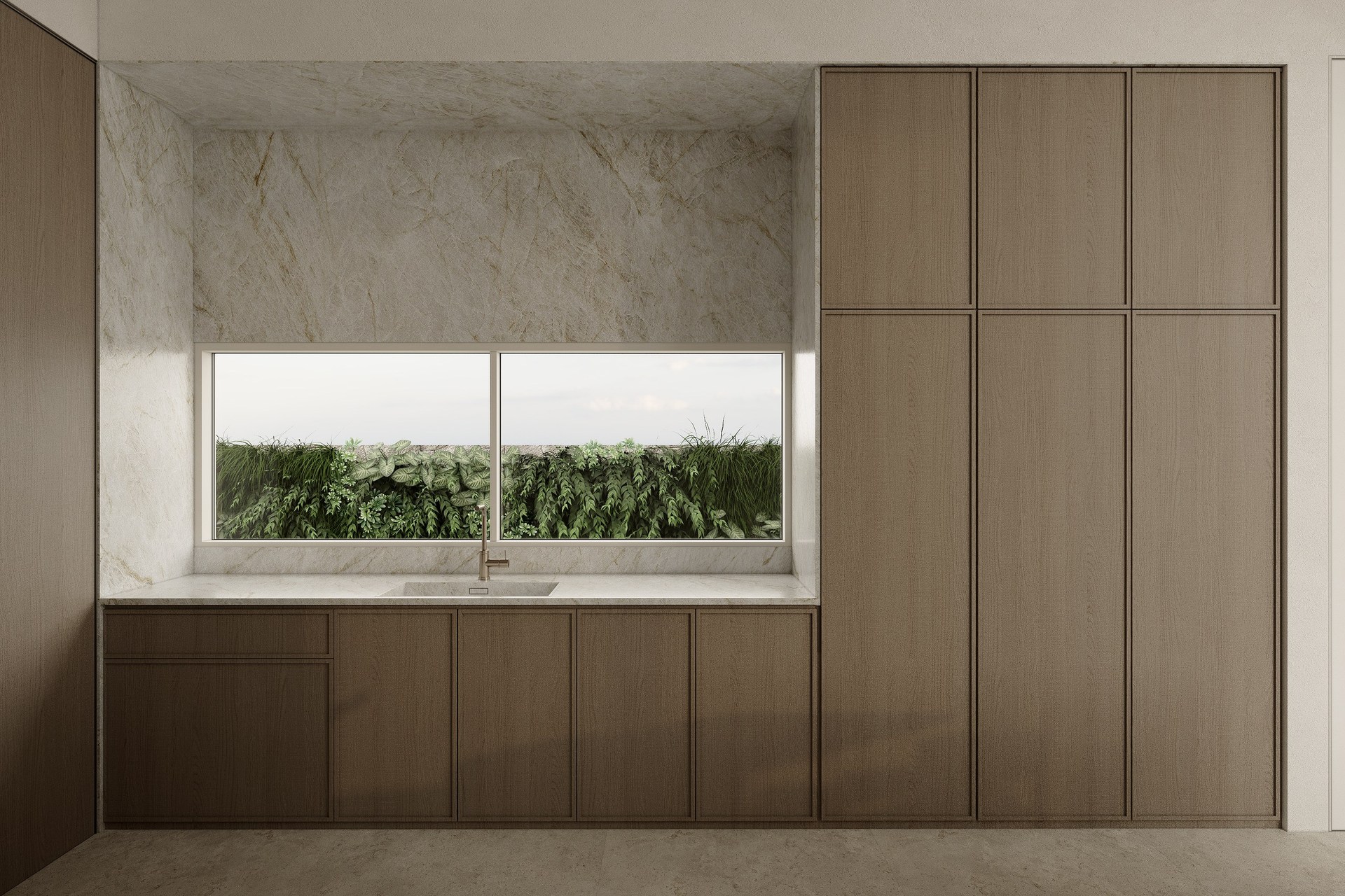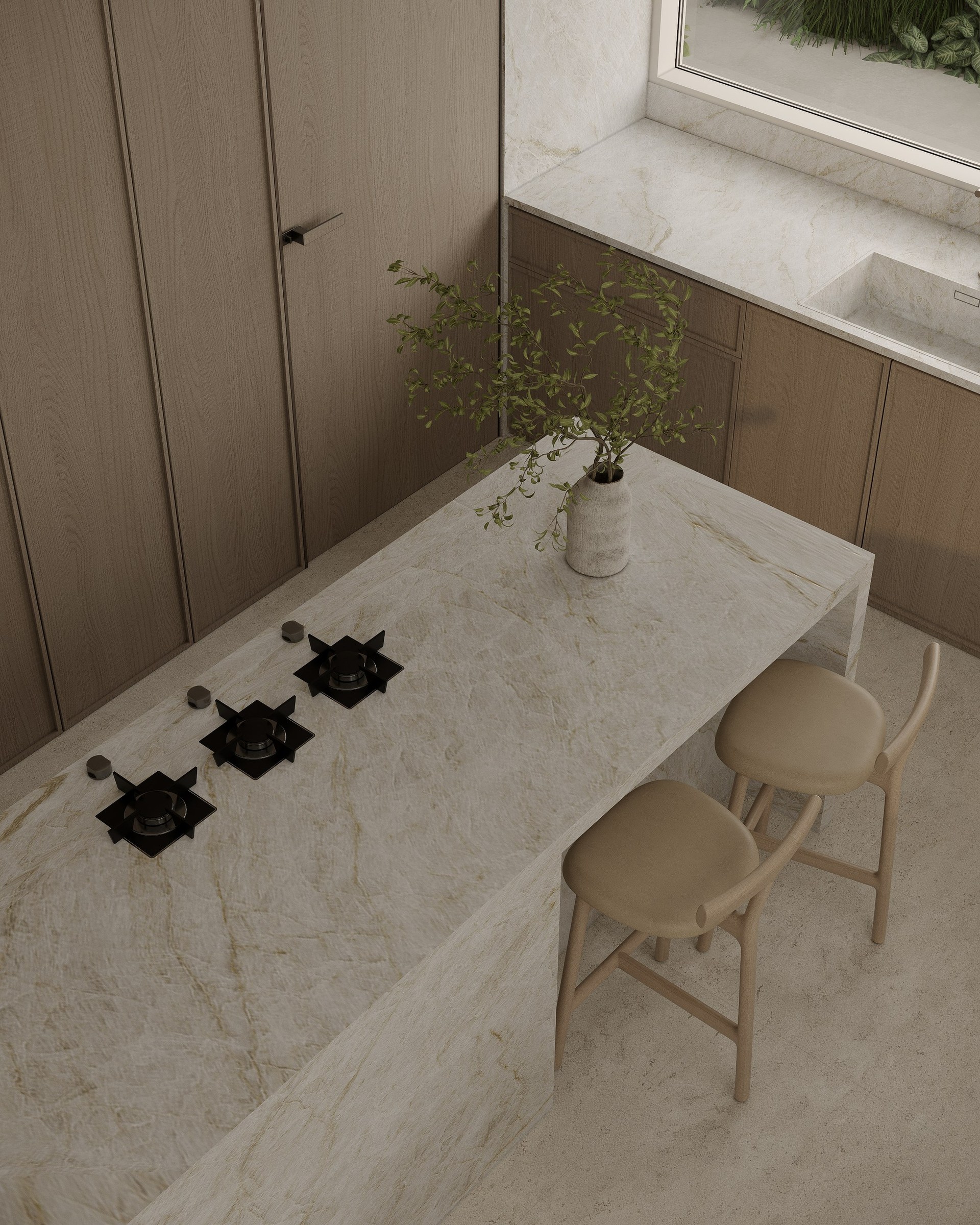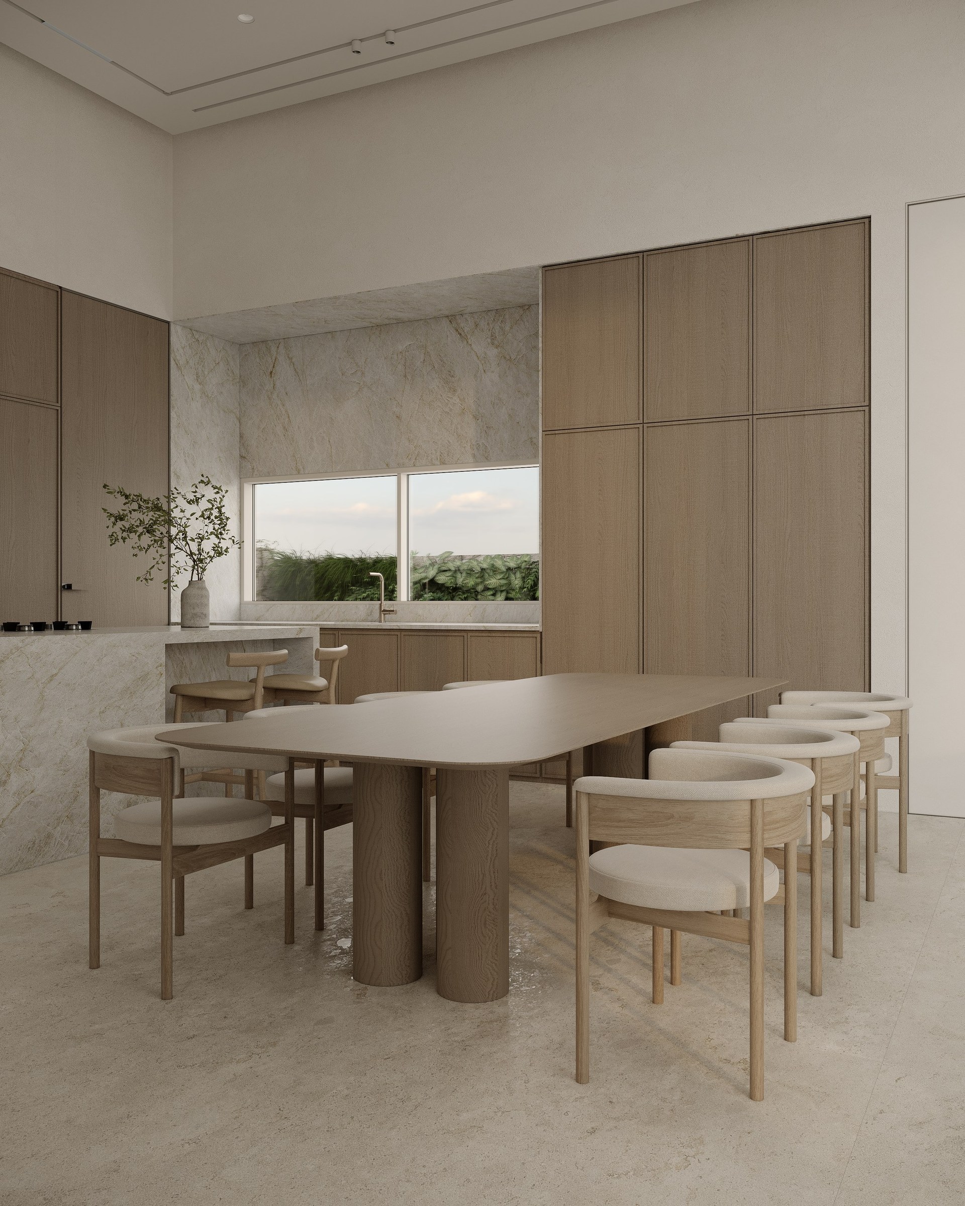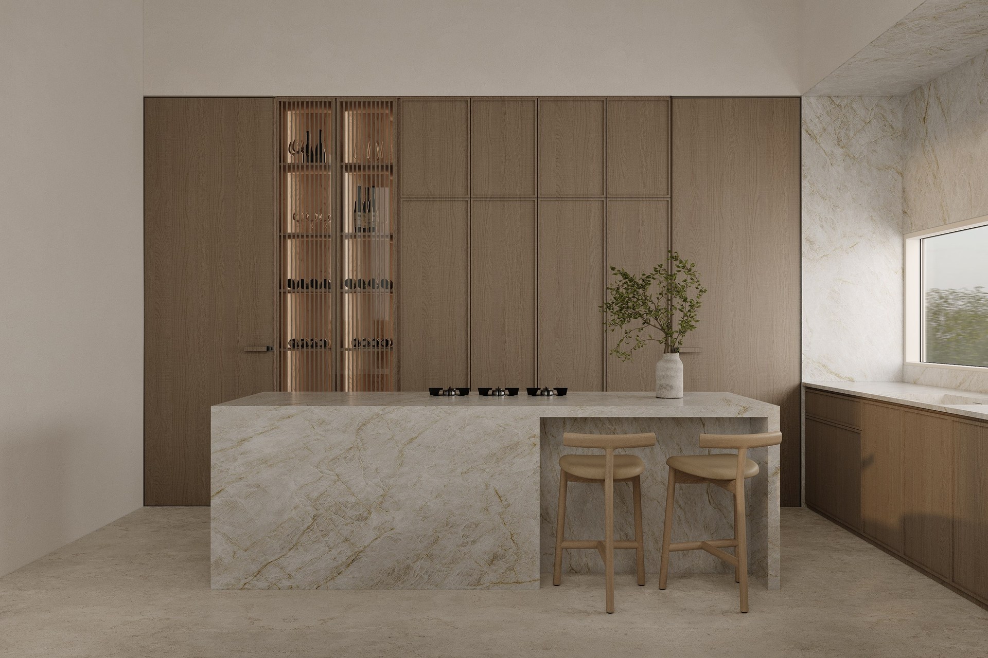 Multi-version interior visualization study for a sophisticated residential project, exploring different lighting and material moods.