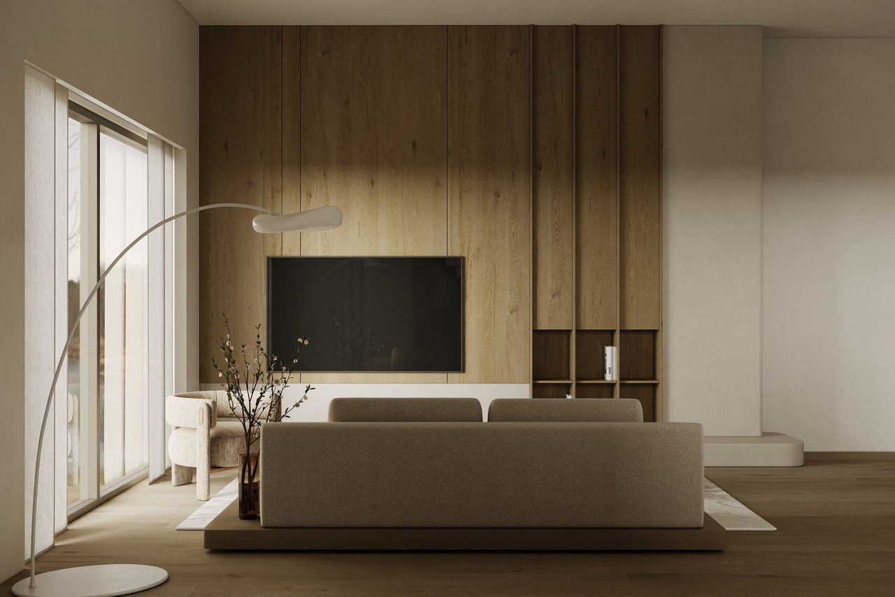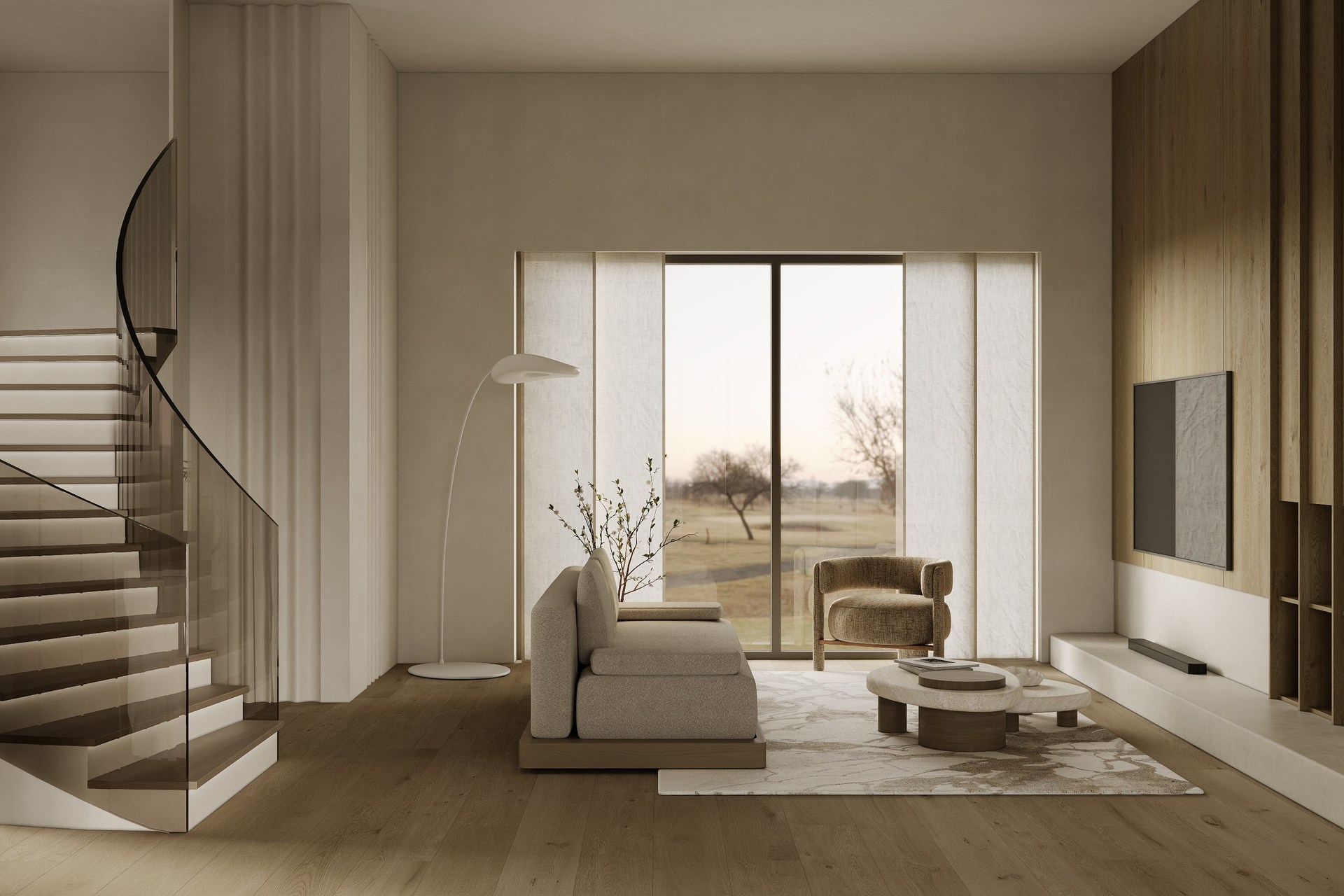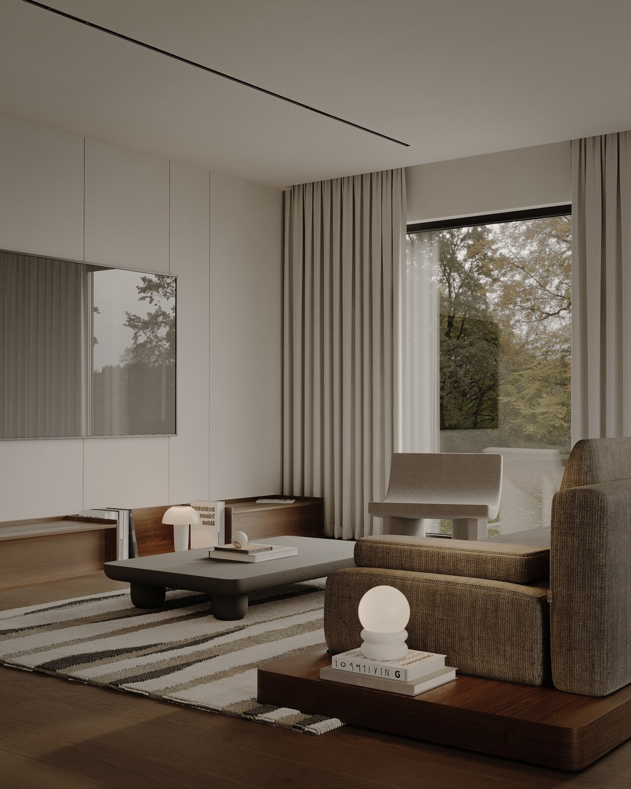 High-end interior visualization project featuring the Sofa Linea collection, showcasing elegant material palettes and contemporary architectural details.