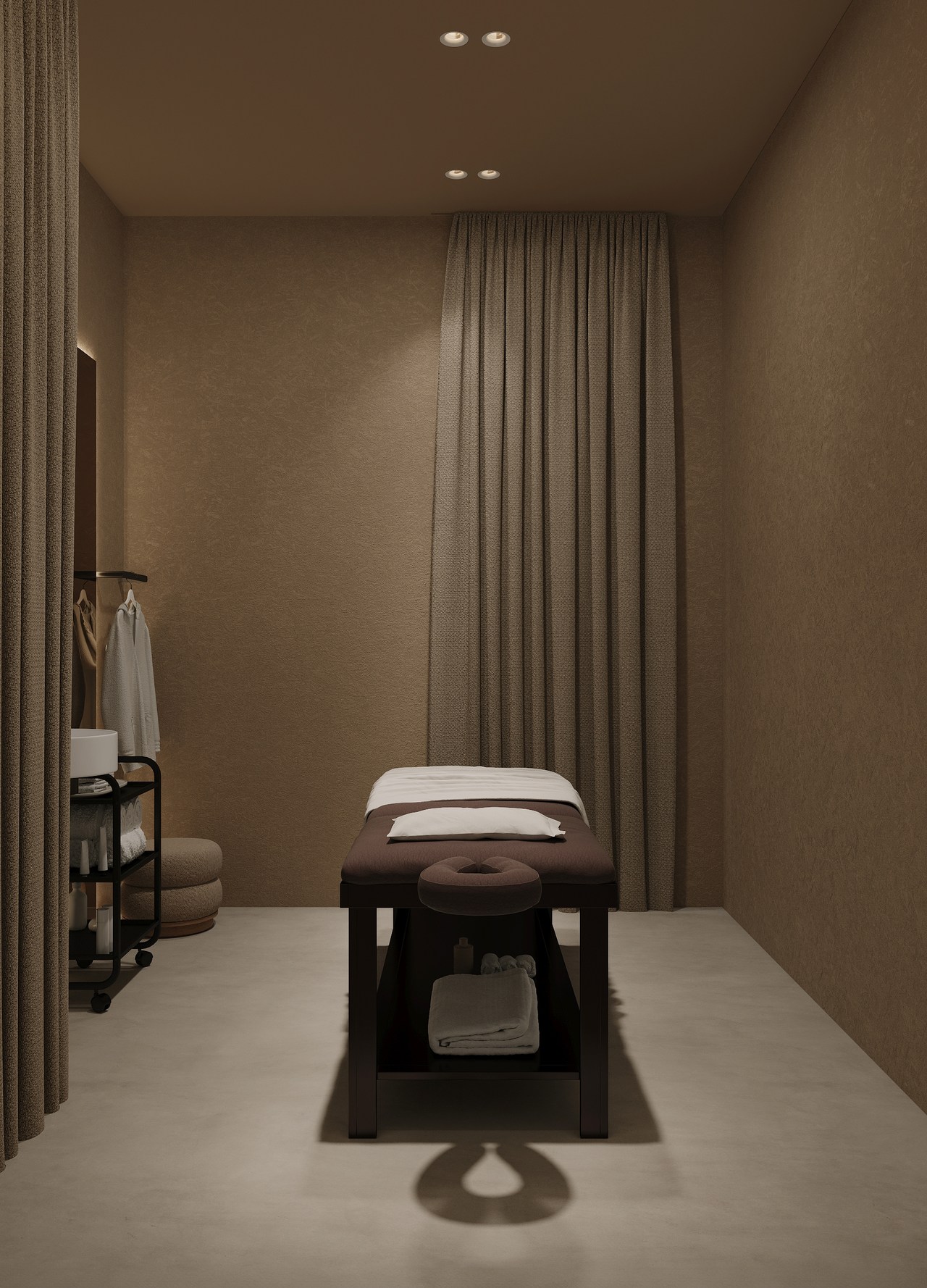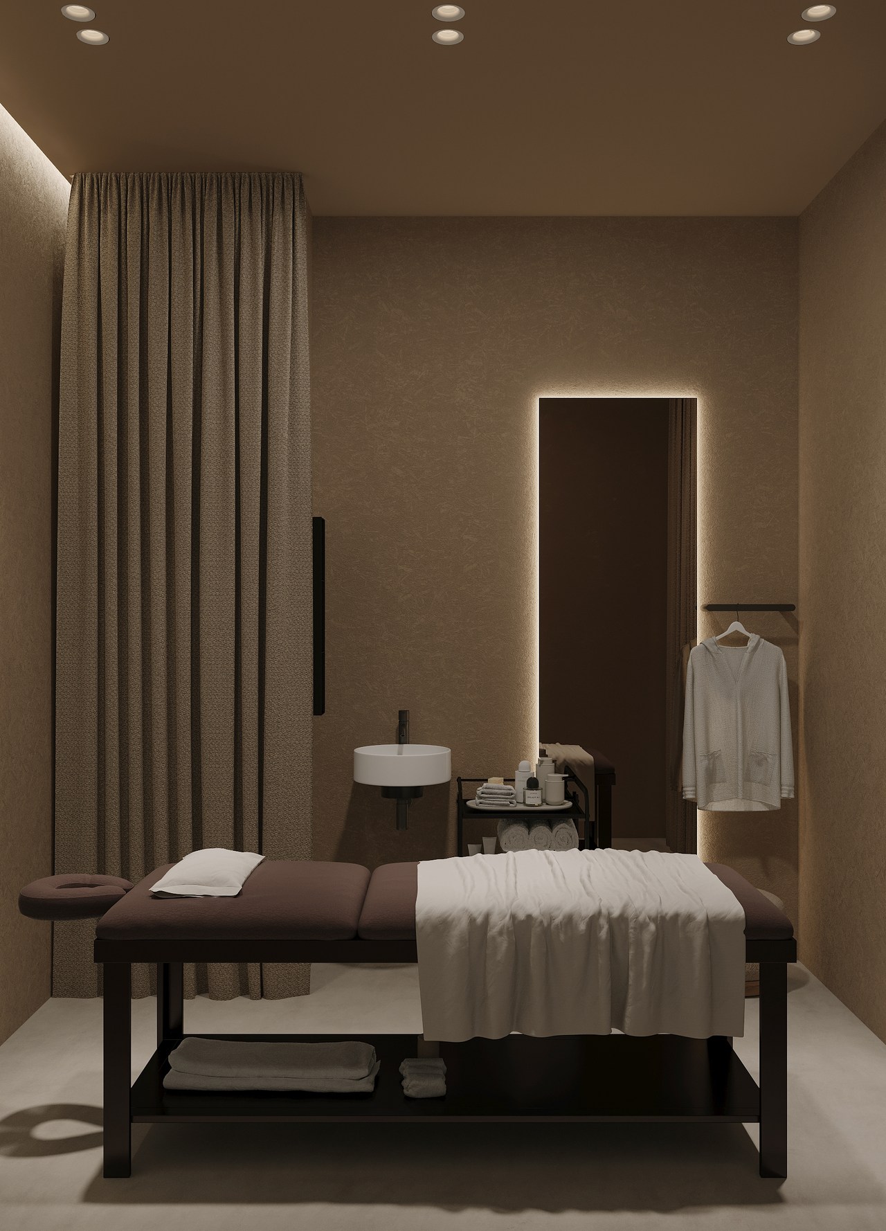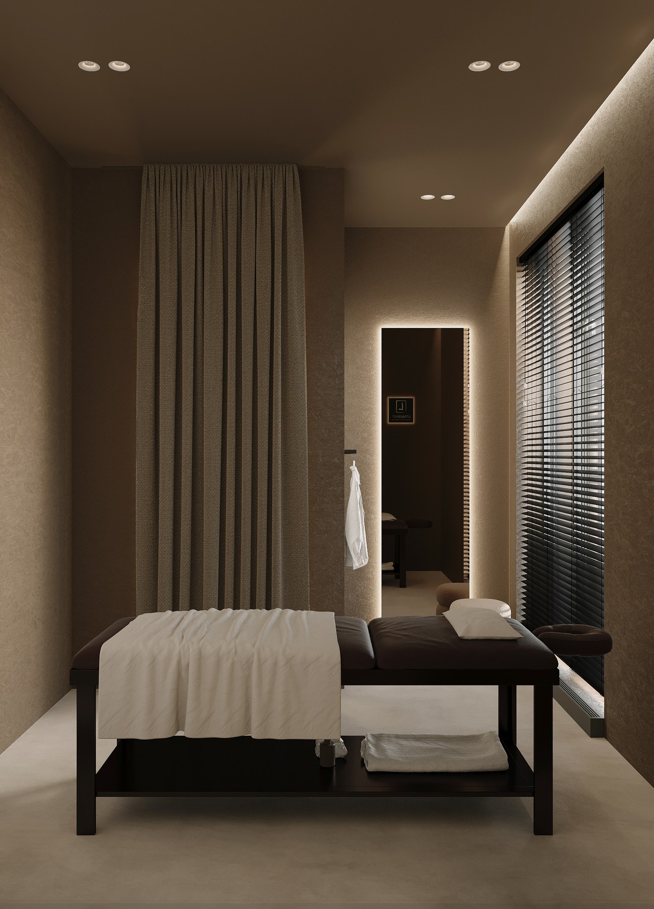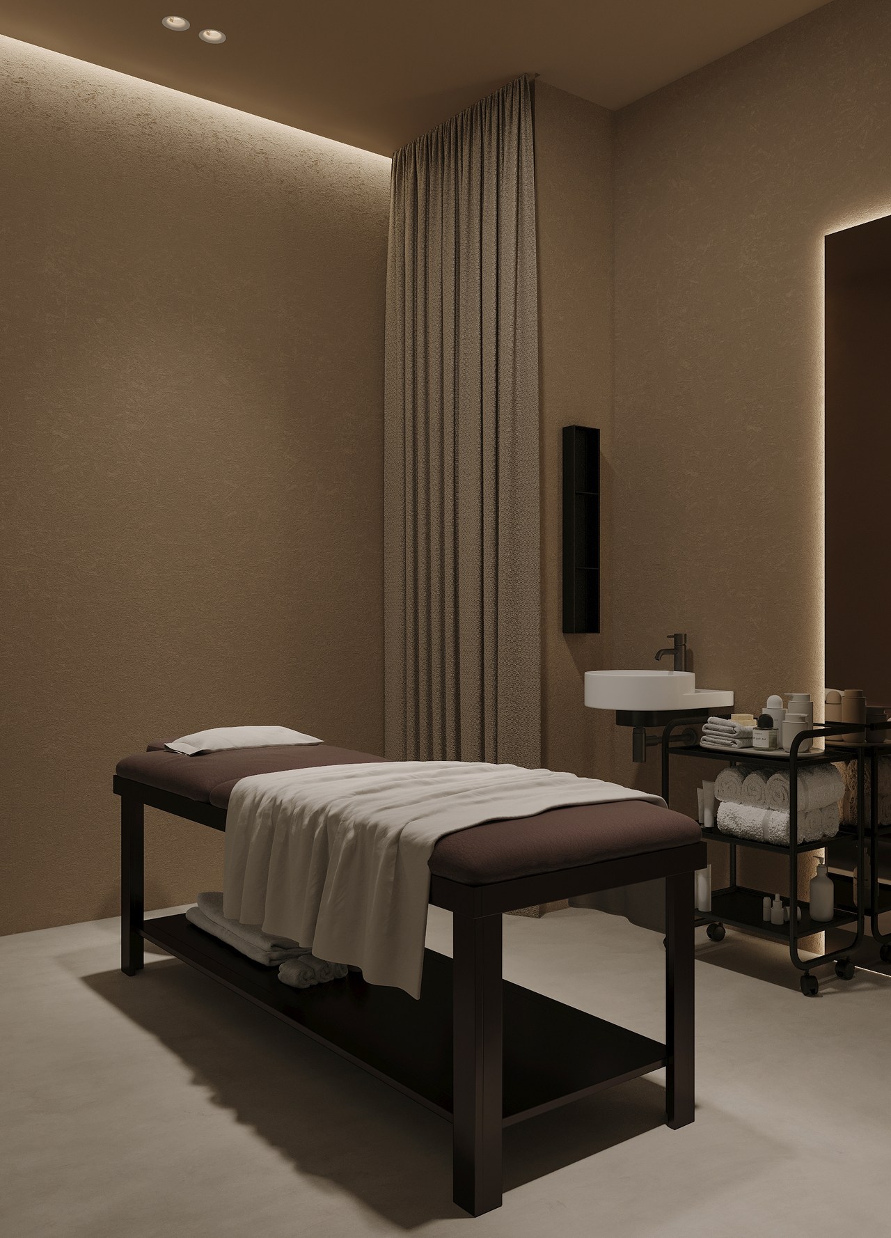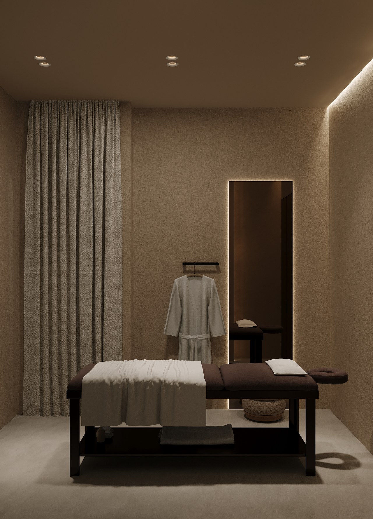 Professional interior visualization for a wellness studio, featuring specialized facial and body treatment rooms with a calming aesthetic.