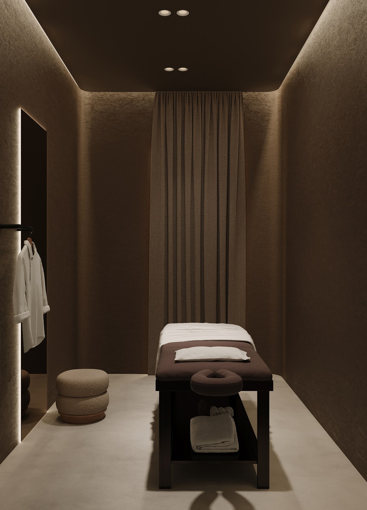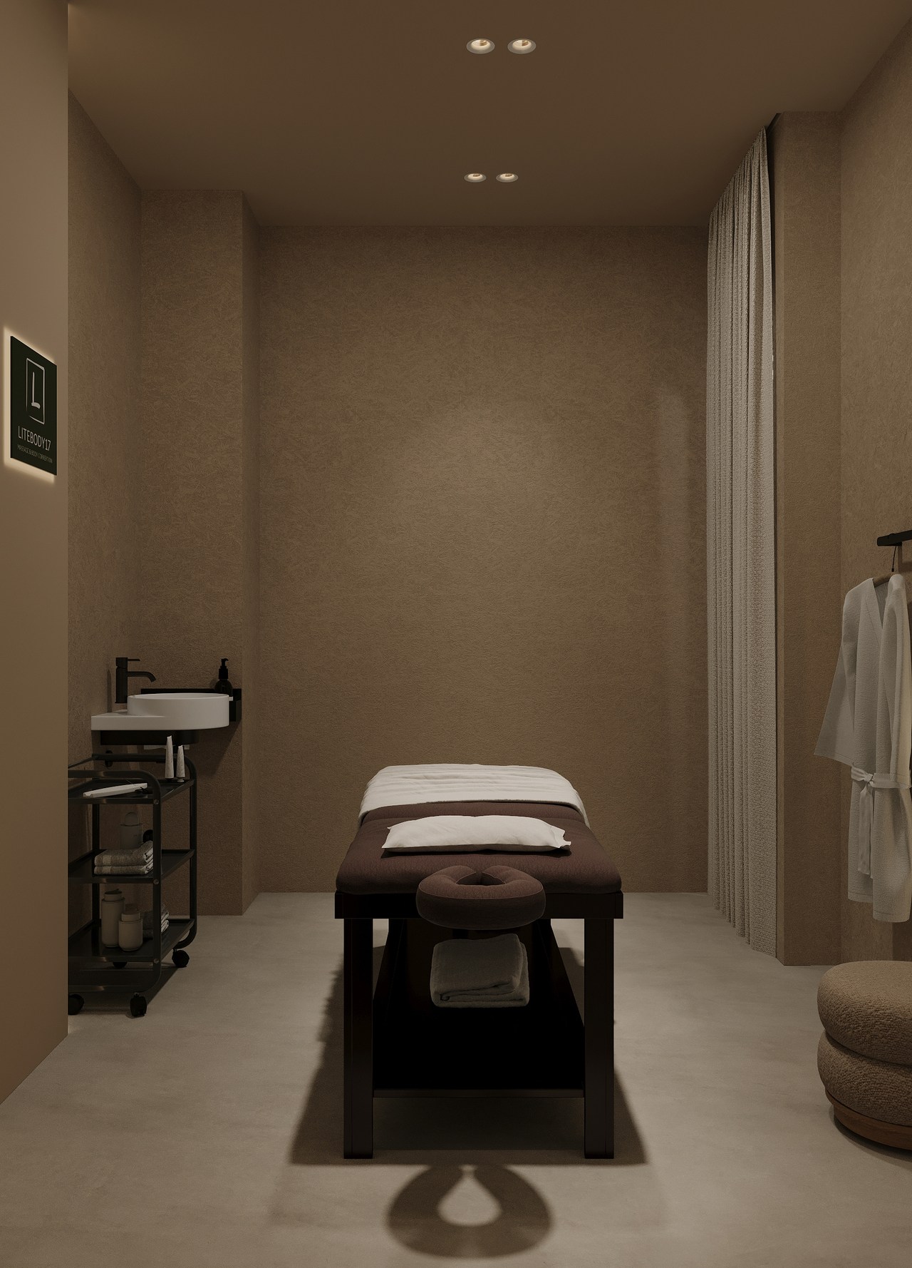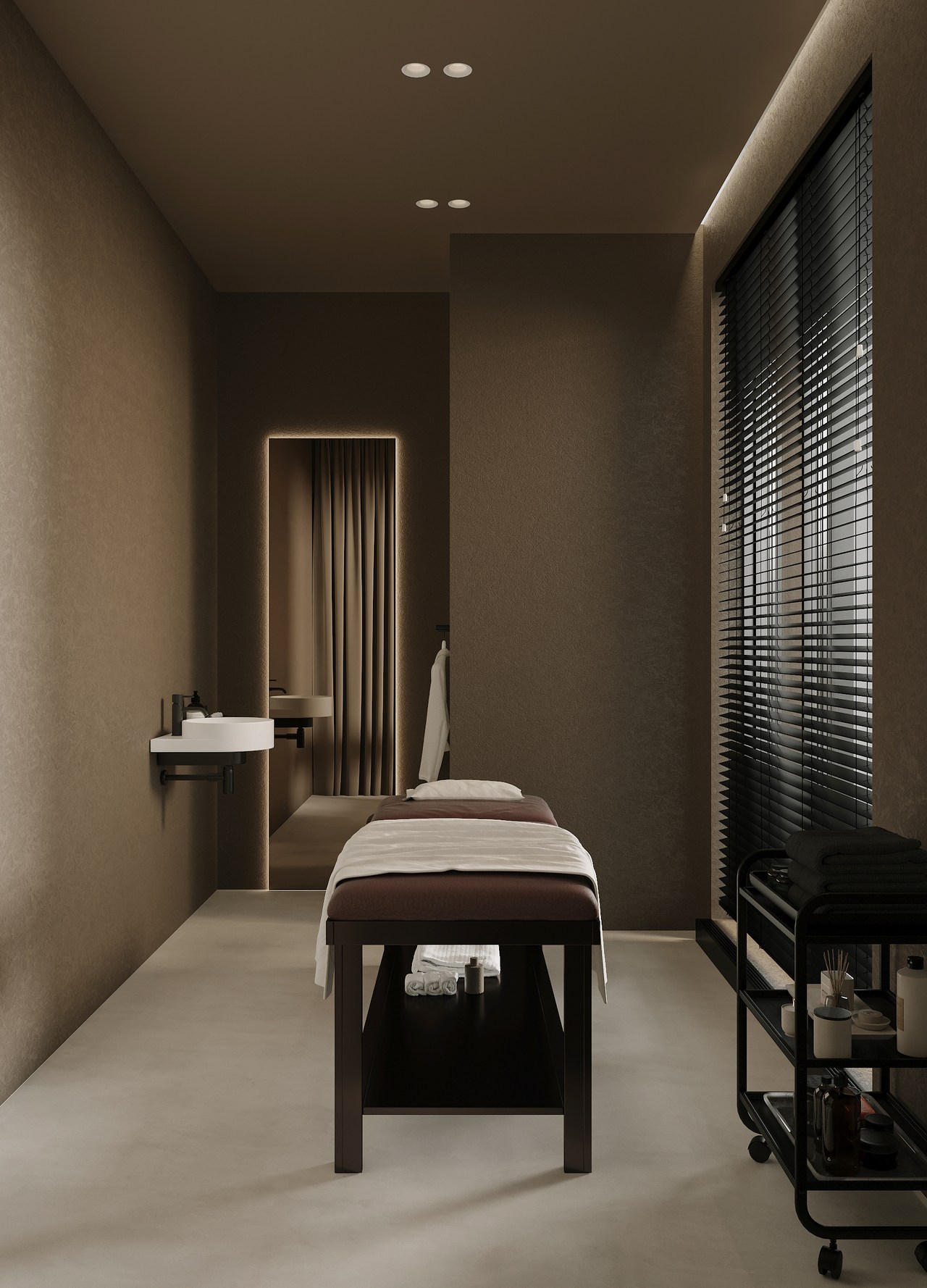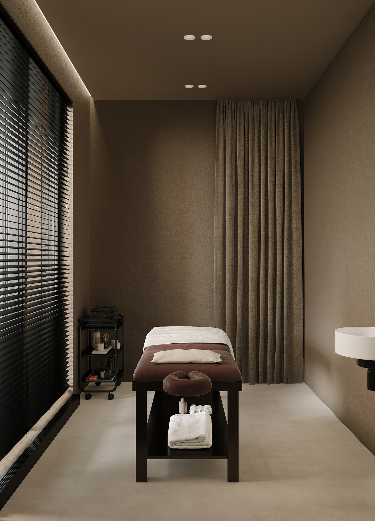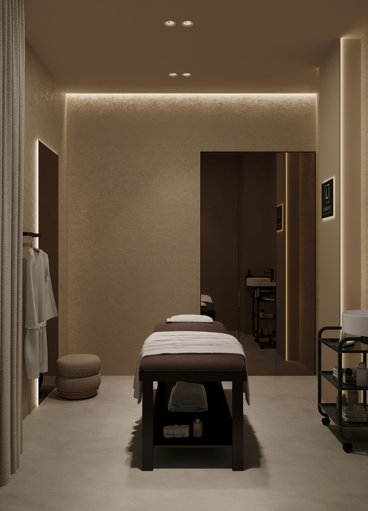 Professional interior visualization for a wellness studio, featuring specialized facial and body treatment rooms with a calming aesthetic.