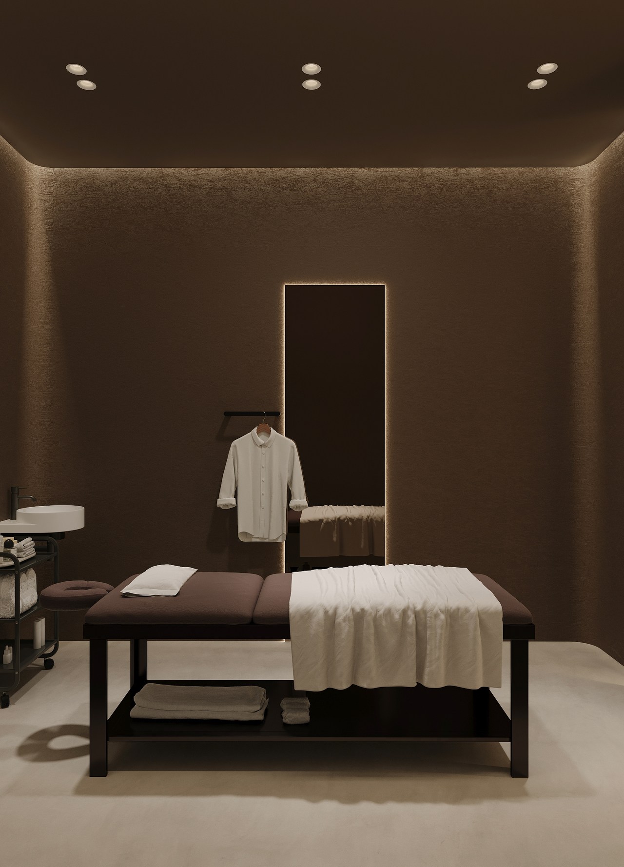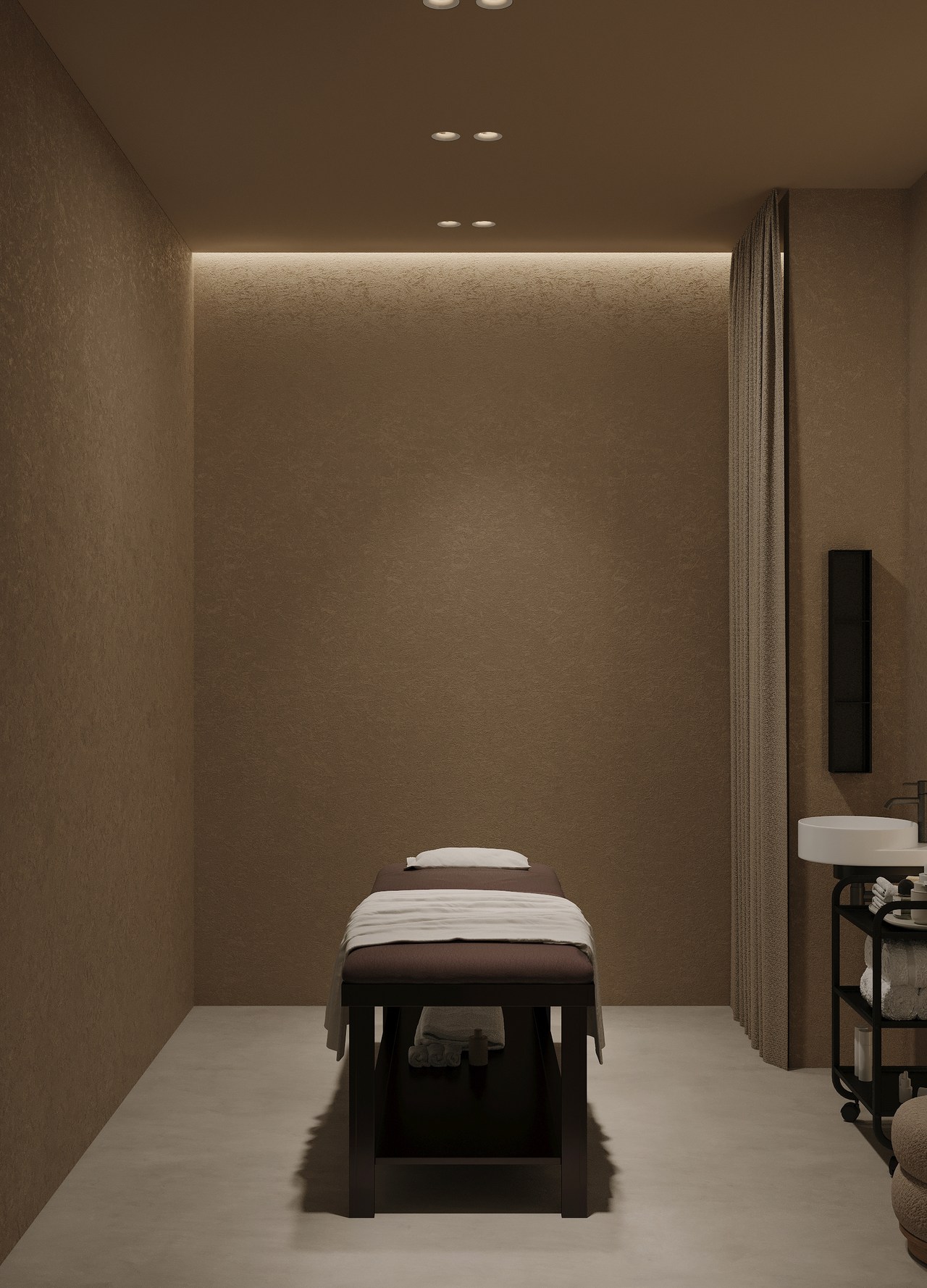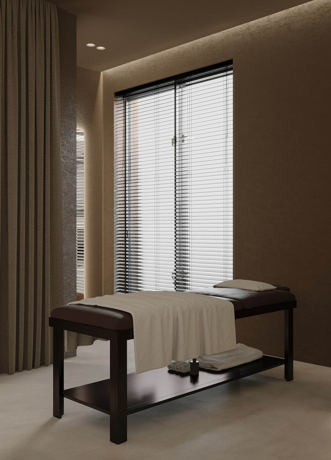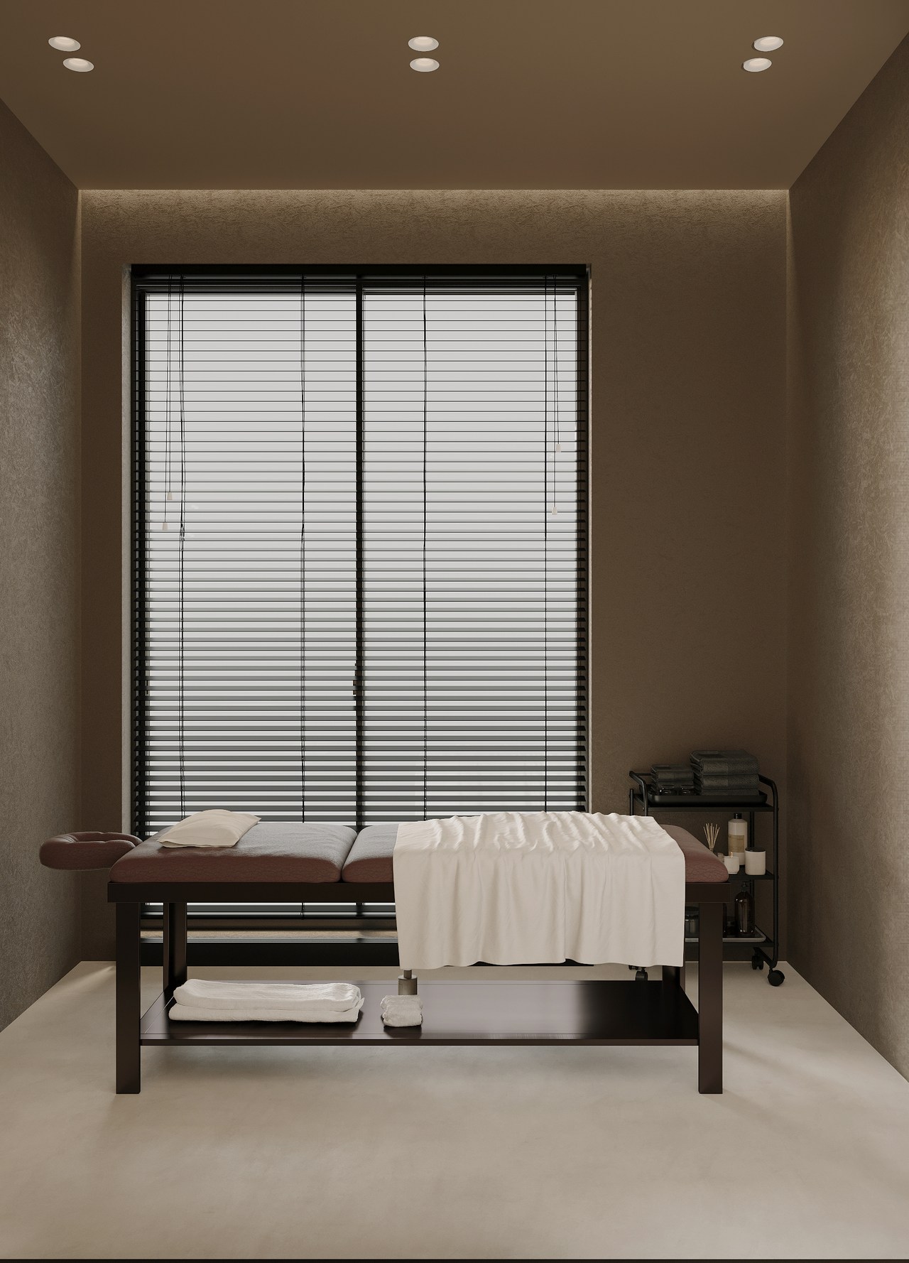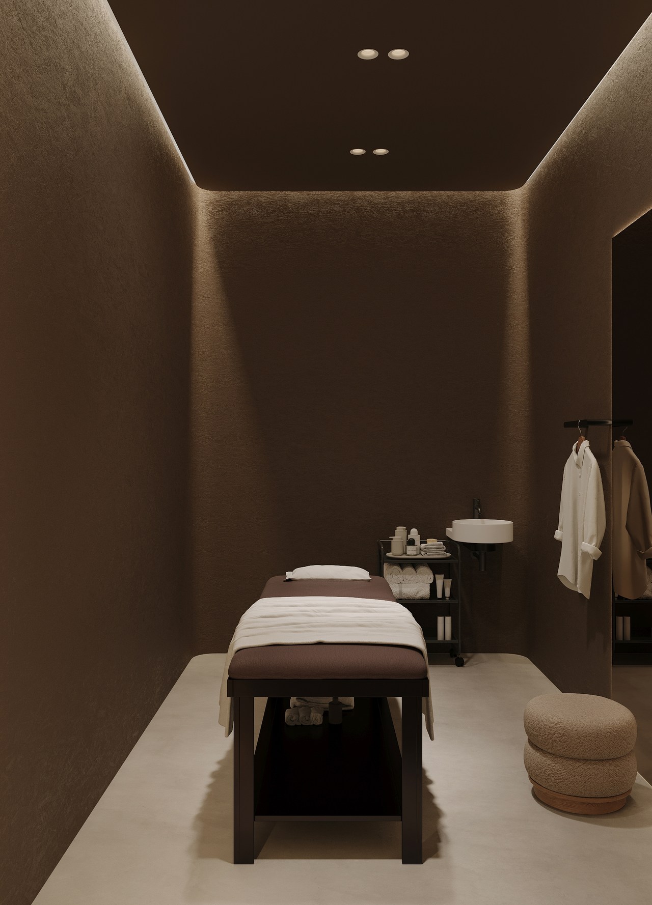 Professional interior visualization for a wellness studio, featuring specialized facial and body treatment rooms with a calming aesthetic.