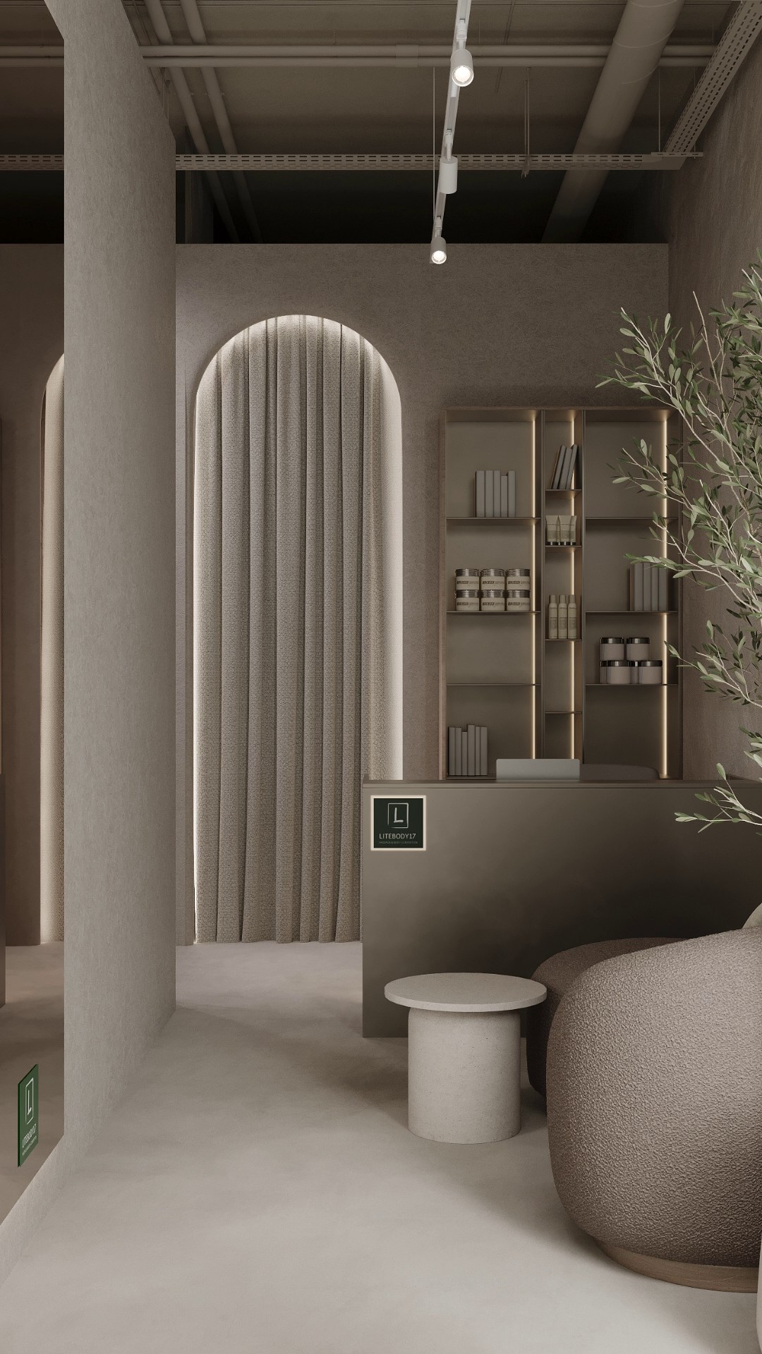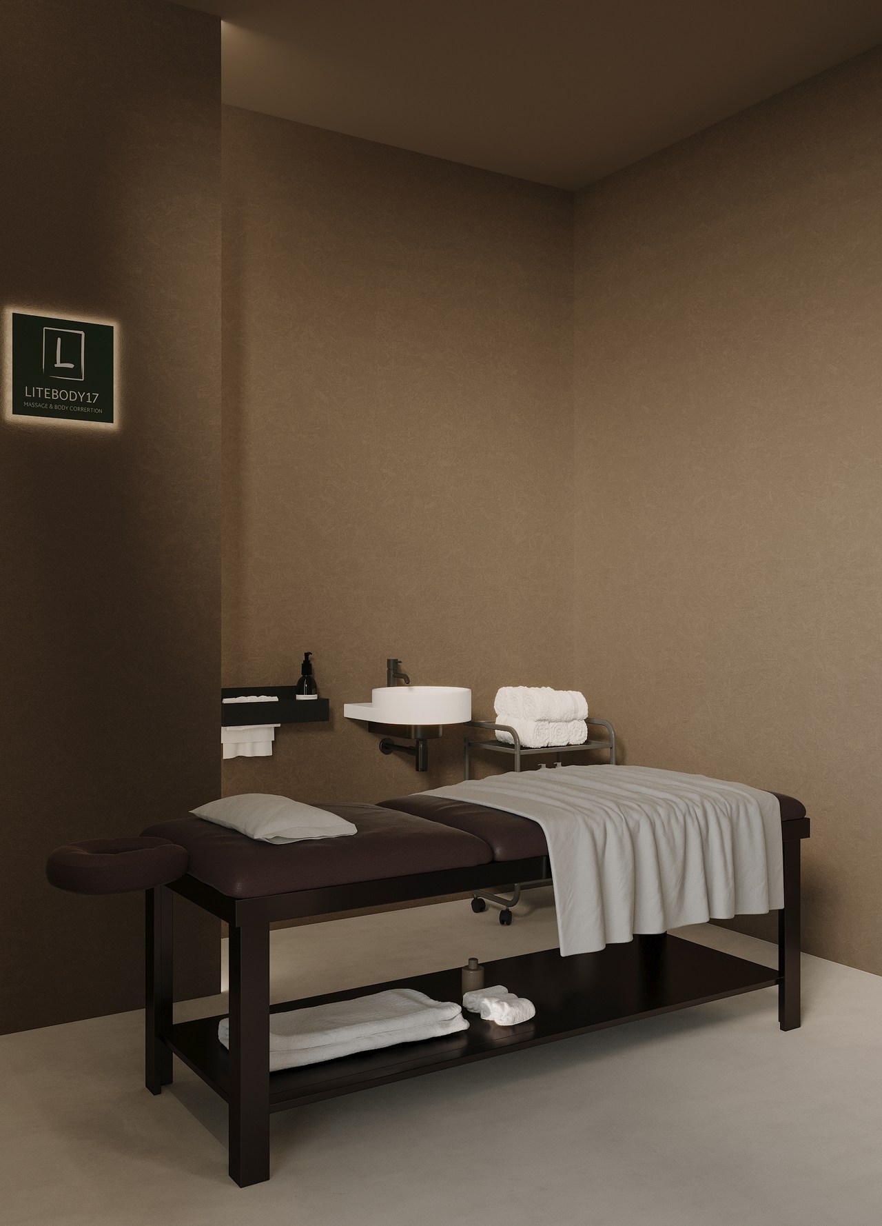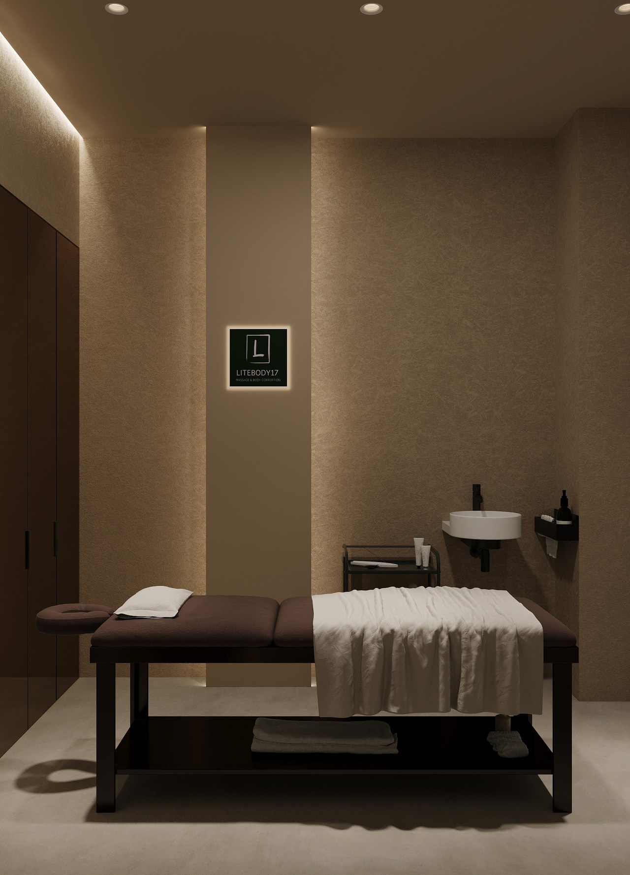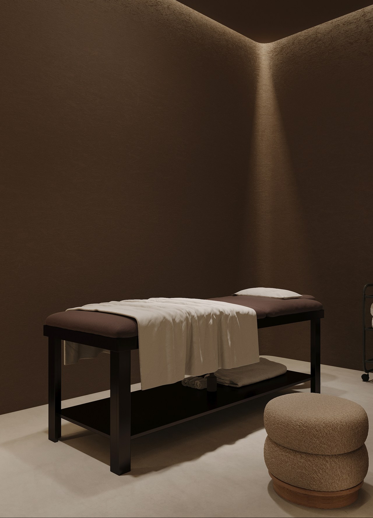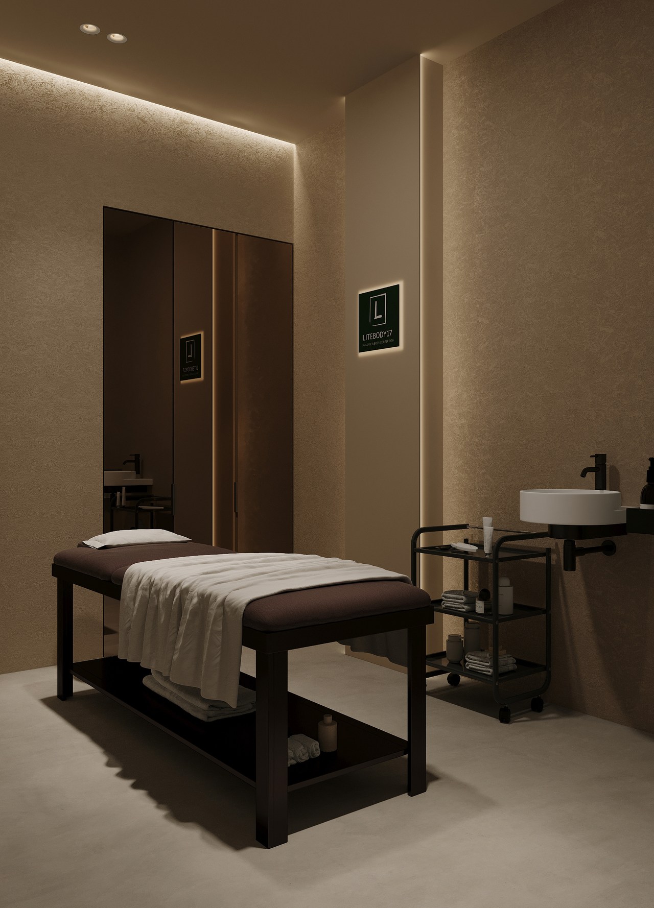 Professional interior visualization for a wellness studio, featuring specialized facial and body treatment rooms with a calming aesthetic.