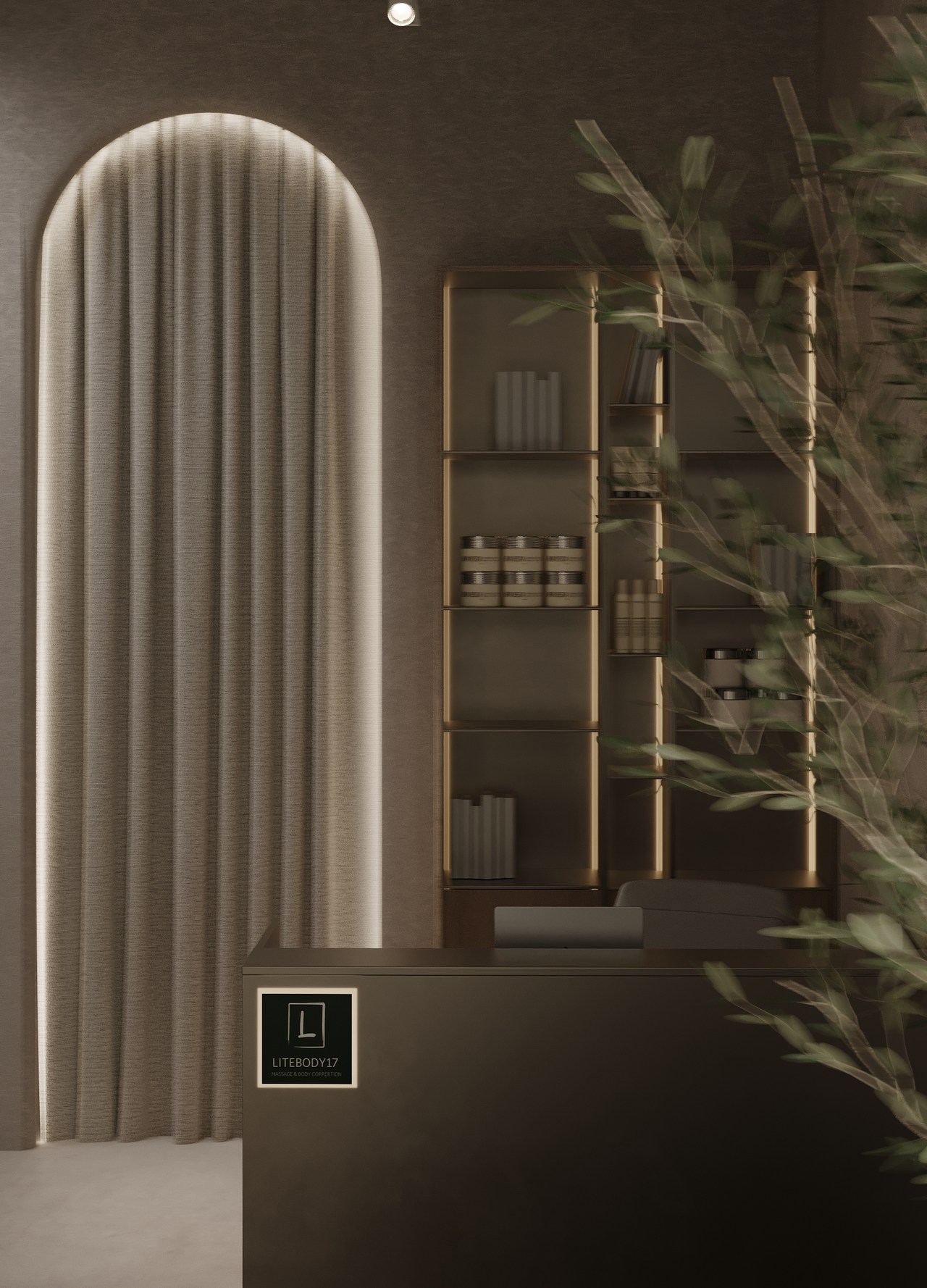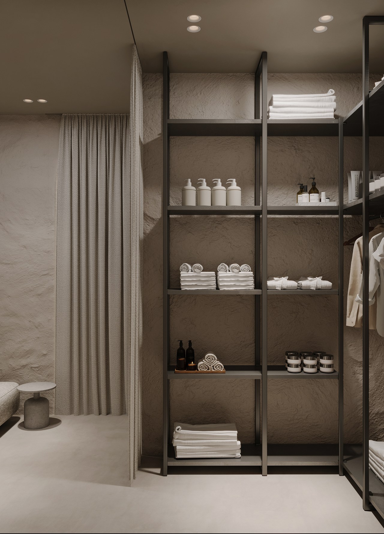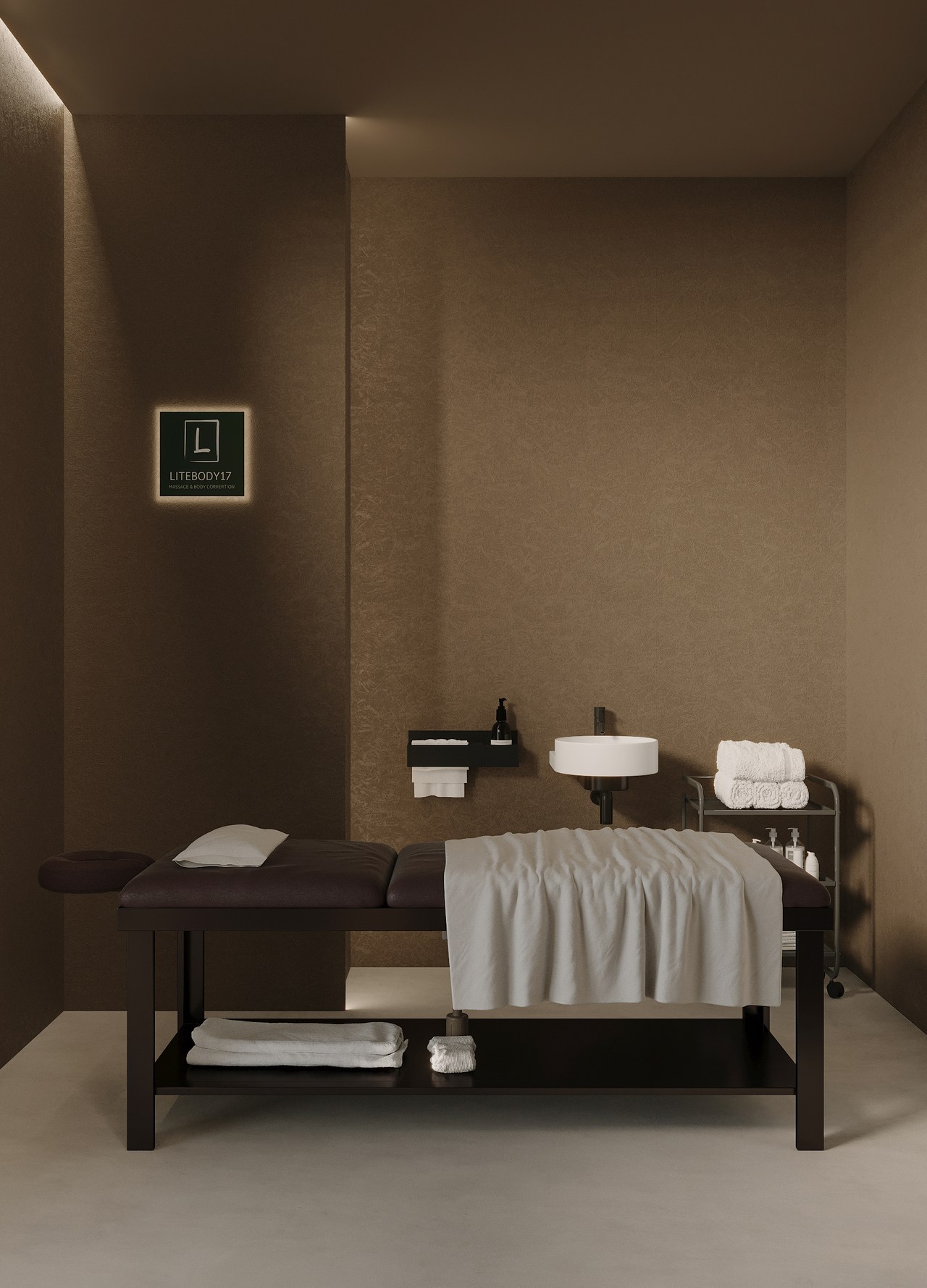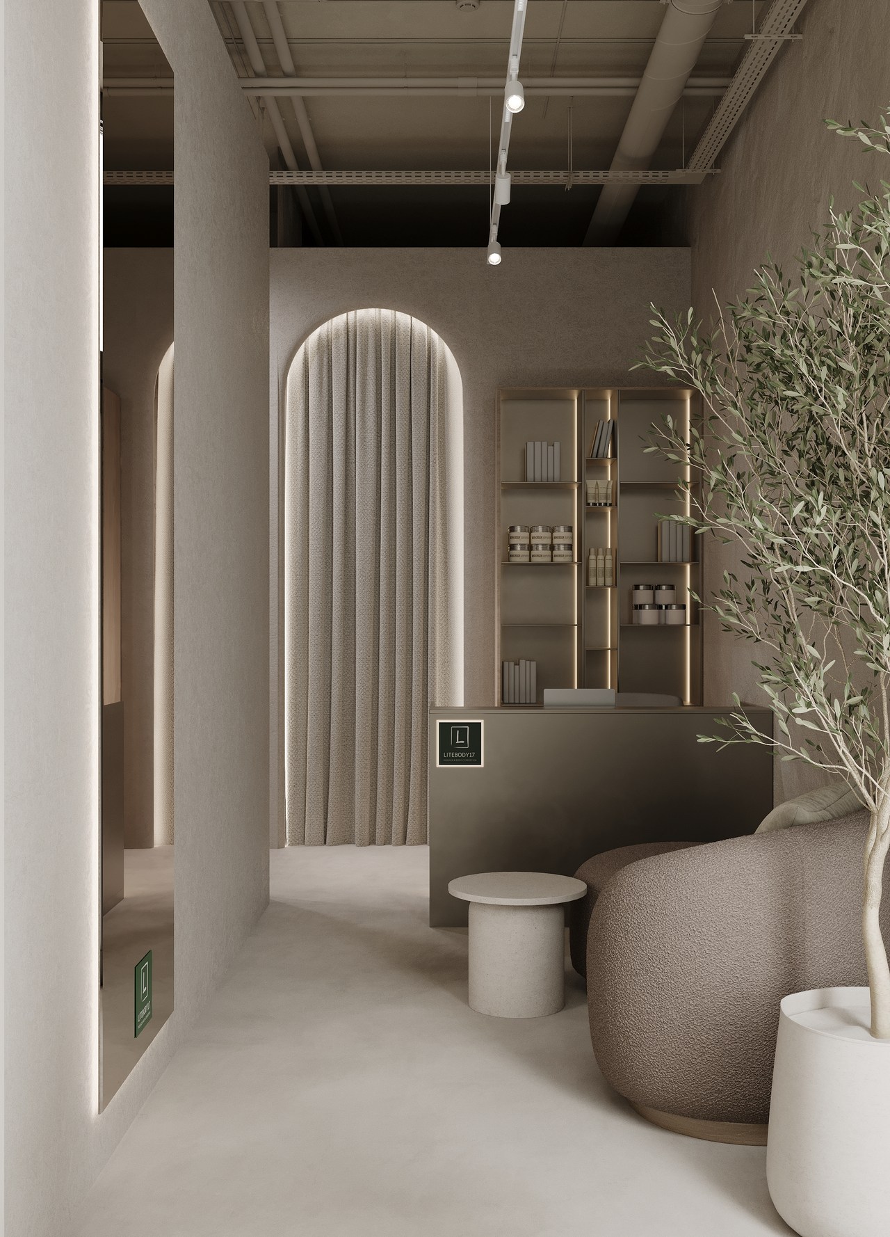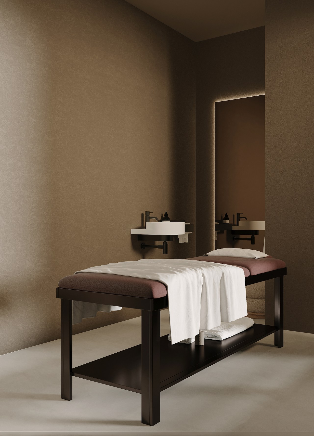 Professional interior visualization for a wellness studio, featuring specialized facial and body treatment rooms with a calming aesthetic.
