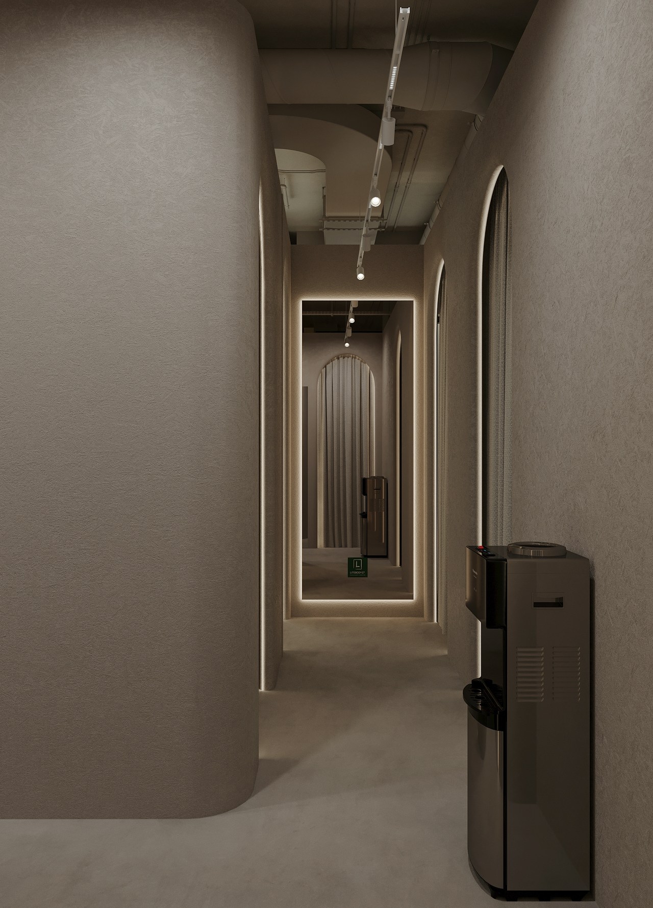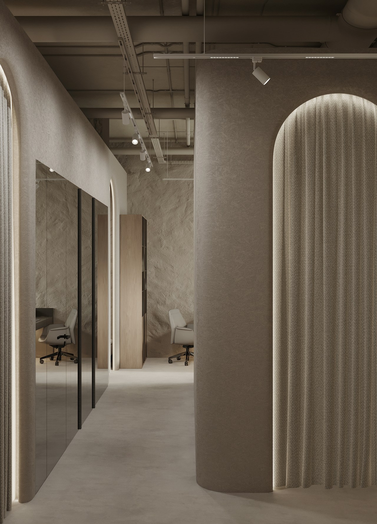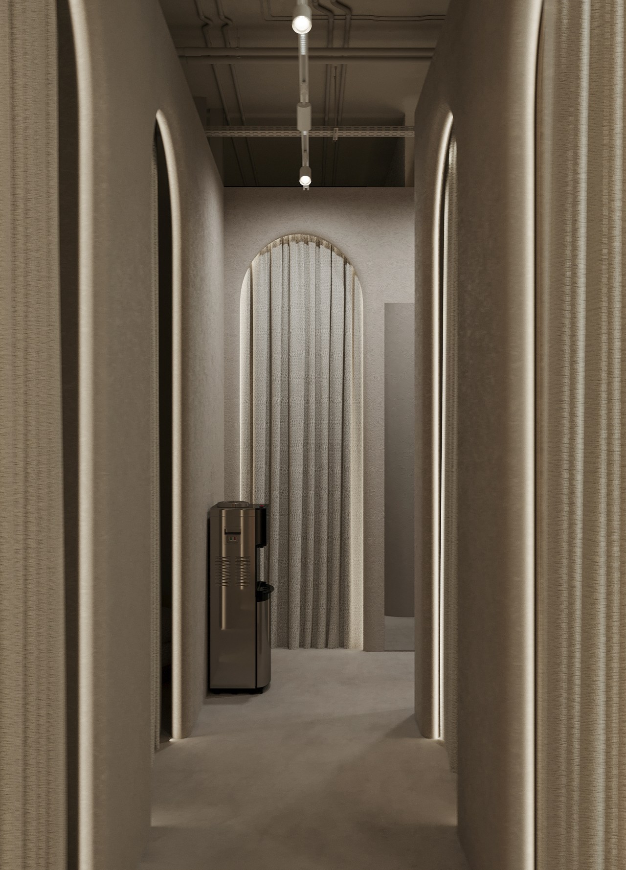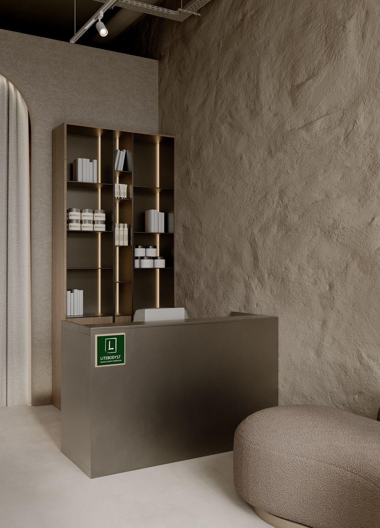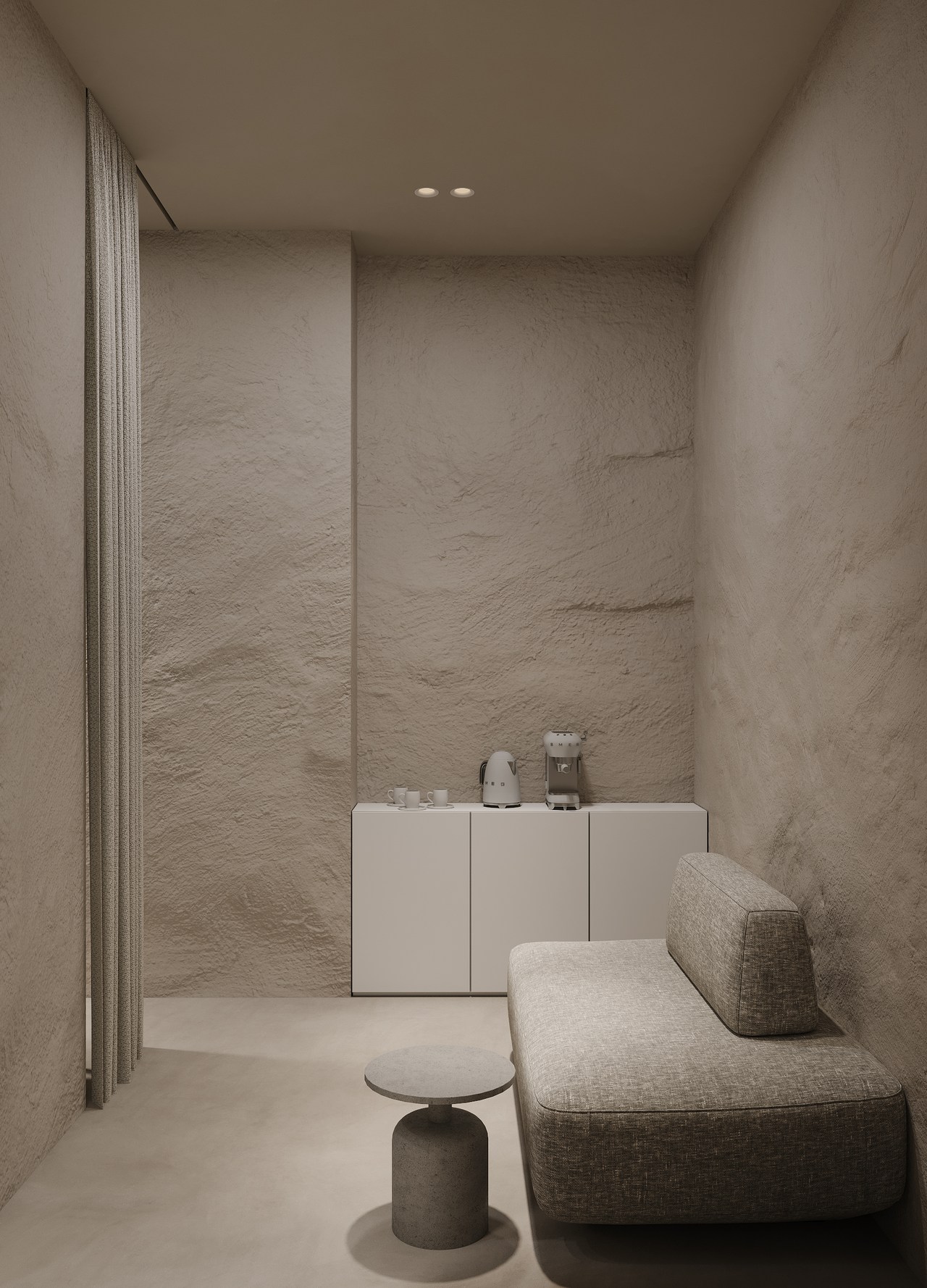 Professional interior visualization for a wellness studio, featuring specialized facial and body treatment rooms with a calming aesthetic.